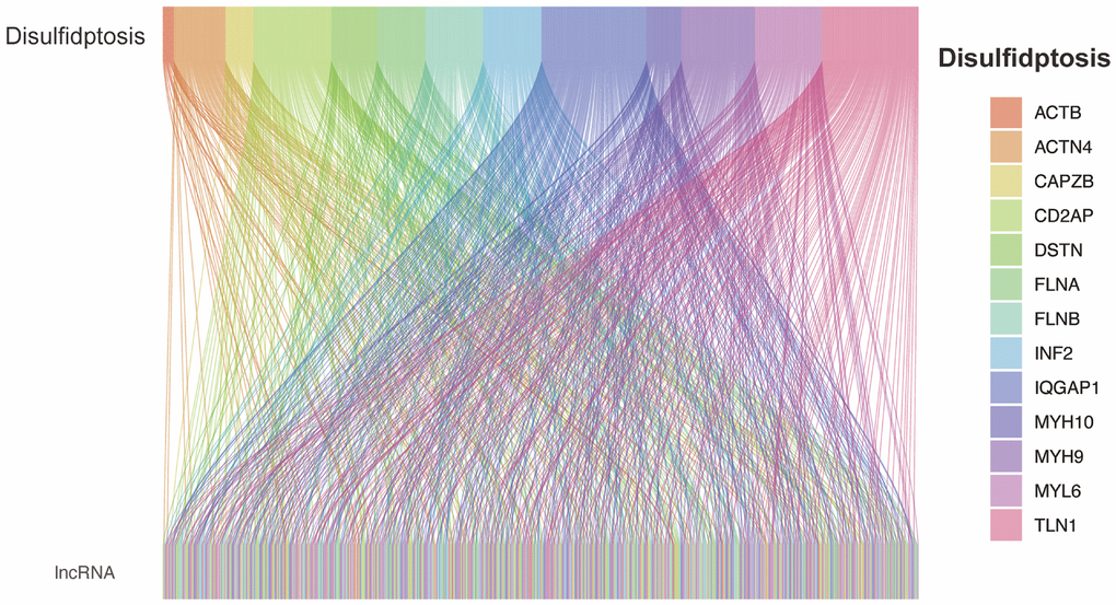 Many cancer therapies aim to kill cancer cells by inducing apoptosis. However, cancer cells often find ways to evade apoptosis, leading to treatment resistance and disease relapse. Disulfideptosis, a recently discovered form of cell death, may open new avenues for cancer diagnosis and treatment strategies. Renal clear cell carcinoma is one of the most common malignancies globally, characterized by subtle early symptoms, high recurrence rates, and a propensity for metastasis, which have drawn clinical attention [16]. In recent years, the important role of long non-coding RNA (lncRNA) in the occurrence and development of various cancers has been increasingly recognized [17]. Especially certain lncRNAs that are associated with Disulfideptosis, their expression and their role in renal clear cell carcinoma have not been extensively studied. Therefore, their performance and significance in renal clear cell carcinoma warrant further investigation.