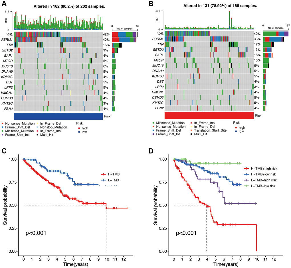 Based on the high and low TMB values, we divided the patients into high and low-risk groups (Figure 10A, 10B). The total mutation frequency in the low-risk group was 80.2%, while in the high-risk group, it was 78.92%, which is lower than that in the low-risk group. In the low-risk group, Nonsense Mutation was predominantly observed, while in the high-risk group, Missense Mutation was the major type. The top 15 genes with mutations, ranked by mutation frequency from high to low, are VHL, PBRM1, TTN, SETD2, BAP1, MTOR, MUC16, DNAH9, KDM5C, DST, LRP2, HMCN1, CSMD3, KMT2C, and FBN2. The KM curve of TMB in the high and low-risk groups shows that patients with low TMB have a higher probability of long-term survival. The combined analysis of TMB and the risk model score also reveals clear trends in the KM curve (Figure 10C). Patients with low TMB and low-risk scores tend to have better survival outcomes, while those with high TMB and high-risk scores have the poorest prognosis (Figure 10D).