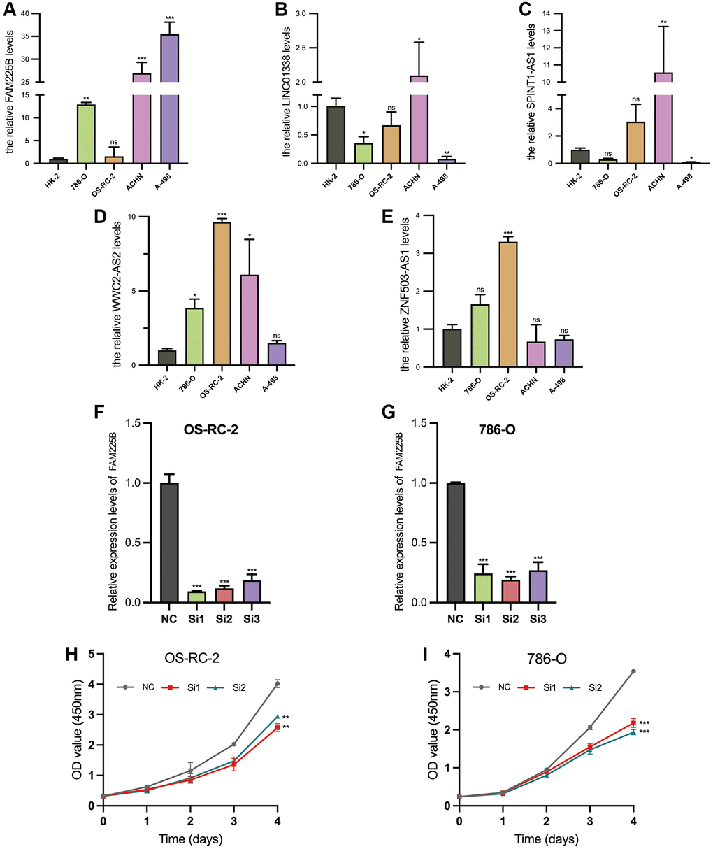 The validated expression levels of the five selected lncRNAs associated with Disulfideptosis (FAM225B, ZNF503-AS1, SPINT1-AS1, WWC2-AS2, LINC01338) in five cell lines (HK-2, 786-O, OS-RC-2, ACHN, A-498) are shown in Figure 11A–11E. From the results, it is evident that FAM225B and WWC2- AS2 are highly expressed in multiple tumor cell lines. The interference efficiency of the two renal tumor cell lines (OS-RC-2, 786-O) is depicted in Figure 11F, 11G. Subsequently, Si1 and Si2 were selected for further studies.