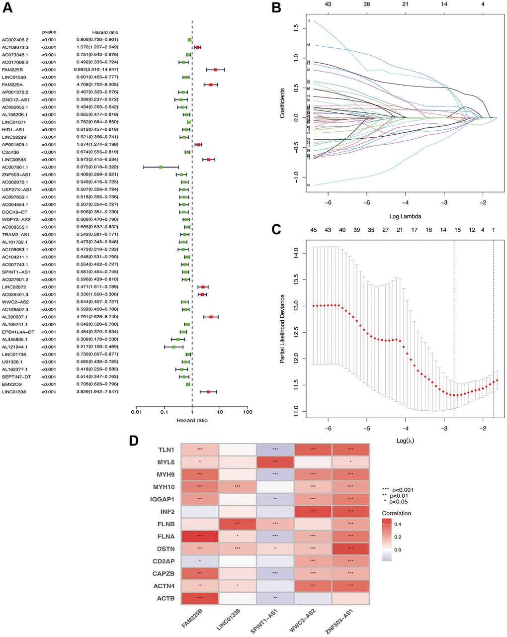 Using R software (packages “survival”, “caret”, “glmnet”, “survminer”, and “timeROC”), we conducted univariate Cox regression analysis on Disulfideptosis-associated lncRNAs (significance criterion was p < 0.001), obtained Disulfideptosis-associated lncRNAs significantly associated with prognosis time, and plotted a forest map. Then we conducted a Lasso regression analysis (randomly dividing it into two groups, performing cross-validation, and finding the minimum error value). After that, we performed a multivariate Cox regression analysis of related factors, filtering out independent prognostic factors (5 disulfidptosis-related lncRNAs), thus constructing the prognostic signature. Using R software (packages “tidyverse”, “ggplot2”, “ggExtra”), we plotted a correlation heatmap of these 5 independent prognostic lncRNAs and 13 Disulfideptosis-associated genes through Pearson correlation analysis (correlation with p < 0.05).