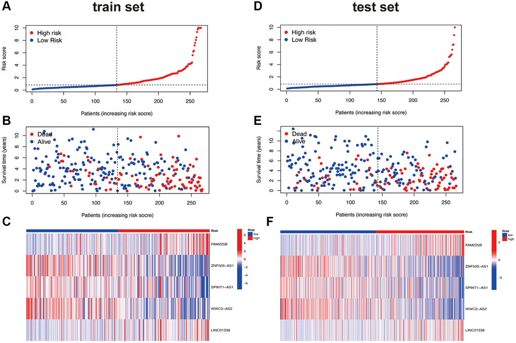 Based on the risk scores obtained from the previous risk model, patients were divided into high and low-risk groups using the median method. The risk curves, survival status curves, and risk heatmaps of all patients are shown in Supplementary Figure 1A–1C. It is evident that our risk model effectively stratifies patients into high and low-risk groups. As the risk score increases, the number of patient deaths also increases, which aligns with our expectations. From the risk heatmap, it is also evident that FAM225B and LINC01338 are positively correlated with the risk score, while ZNF503-AS1, SPINT1-AS1, and WWC2-AS2 are negatively correlated with the risk score. This pattern is consistent in both the randomly assigned train and test groups, demonstrating the consistent and significant performance of the risk model. This internal validation of the risk model is shown in Figure 3A–3F.