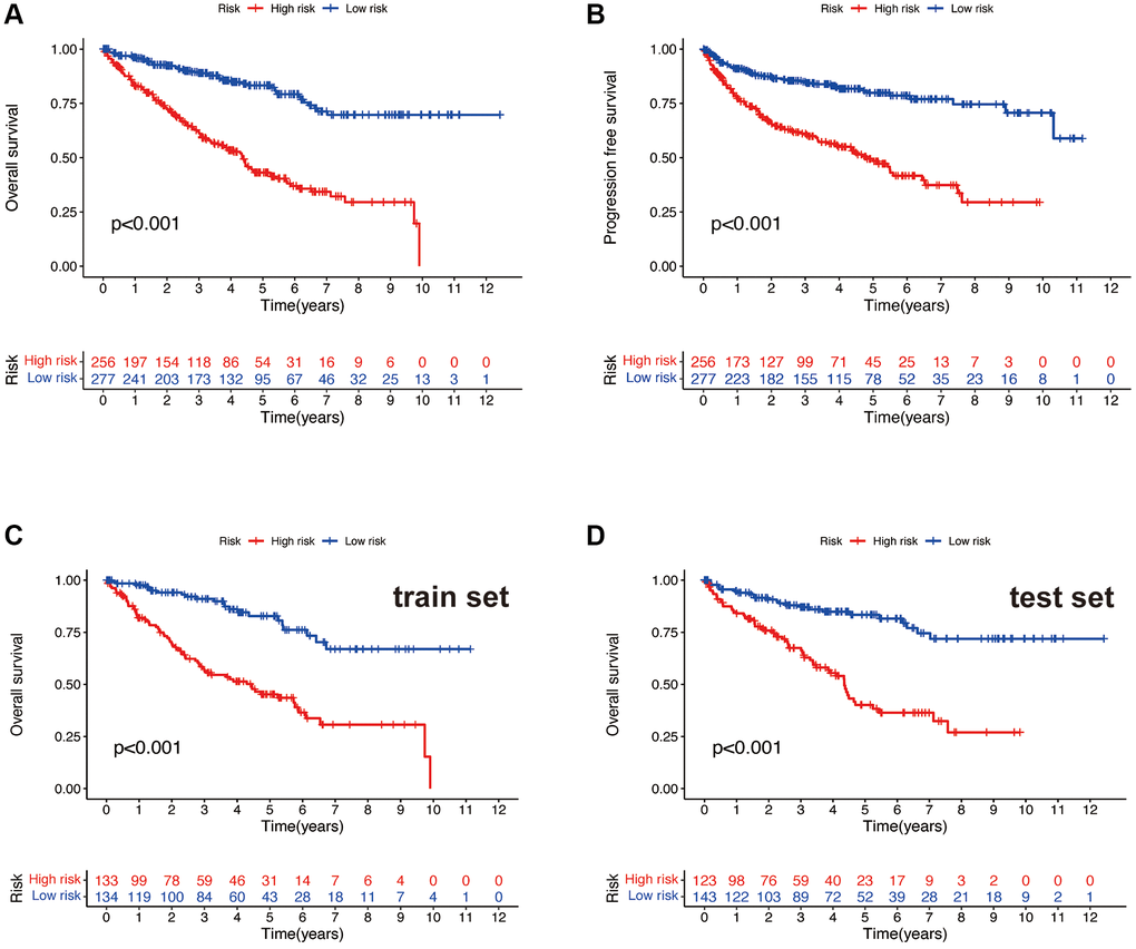 After dividing all samples into high and low-risk groups based on the risk scores, Kaplan-Meier survival curves were used to compare the overall survival rates and progression-free survival rates in the high and low-risk groups of all samples. It is evident that both the overall survival time (Figure 4A) and progression-free survival time (Figure 4B) of the high-risk group are significantly lower than those of the low-risk group (all p < 0.001). To further validate the findings, in both the train and test sets, the high-risk group exhibited significantly lower overall survival time (Figure 4C, 4D) compared to the low-risk group (all p < 0.001). This indicates that the risk model can effectively distinguish patients with different survival outcomes, demonstrating its favorable predictive performance.