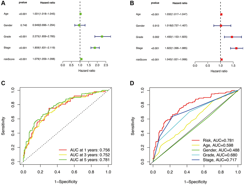 To validate whether our constructed prognostic model is independent of other clinical characteristics (Age, Gender, Grade, Stage) as prognostic factors, we performed independent prognostic analysis. The results of univariate Cox regression analysis and multivariate Cox regression analysis showed that the risk score had a significant impact on prognosis, with p < 0.001 and hazard ratio of 1.079 (1.059–1.098) in univariate analysis, and p < 0.001 and hazard ratio of 1.043 (1.021-1.066) in multivariate analysis. These results are presented in Figure 5A, 5B, indicating that our constructed prognostic model is independent of other clinical characteristics and serves as an independent prognostic factor.