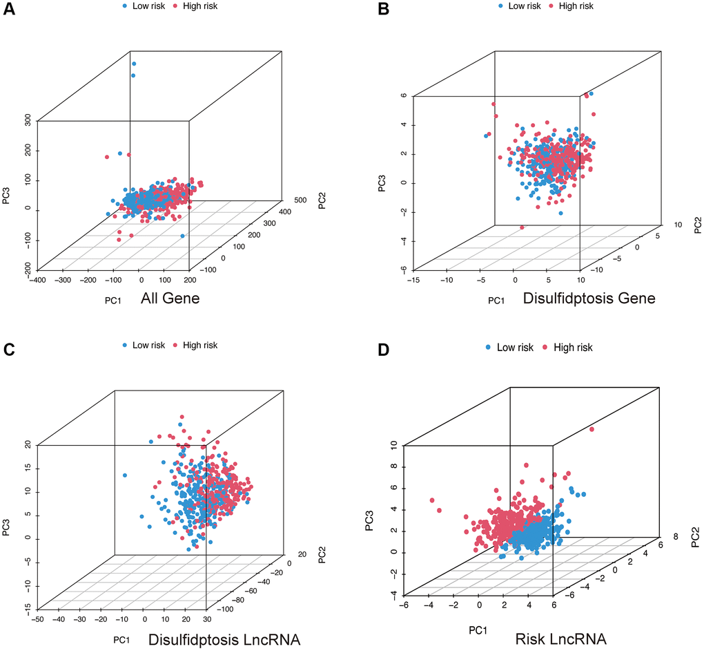 Through Principal Component Analysis (PCA), we can observe whether the lncRNAs involved in model construction can differentiate patients in the high and low-risk groups. From the three-dimensional visualization of the PCA results (Figure 6A–6D), it is evident that in Figure 6D, patients in the high-risk group are positioned in the upper left region of the three-dimensional plot, while patients in the low-risk group are positioned in the lower right region, with a clear boundary. Therefore, the lncRNAs involved in model construction can effectively distinguish patients in the high and low-risk groups.