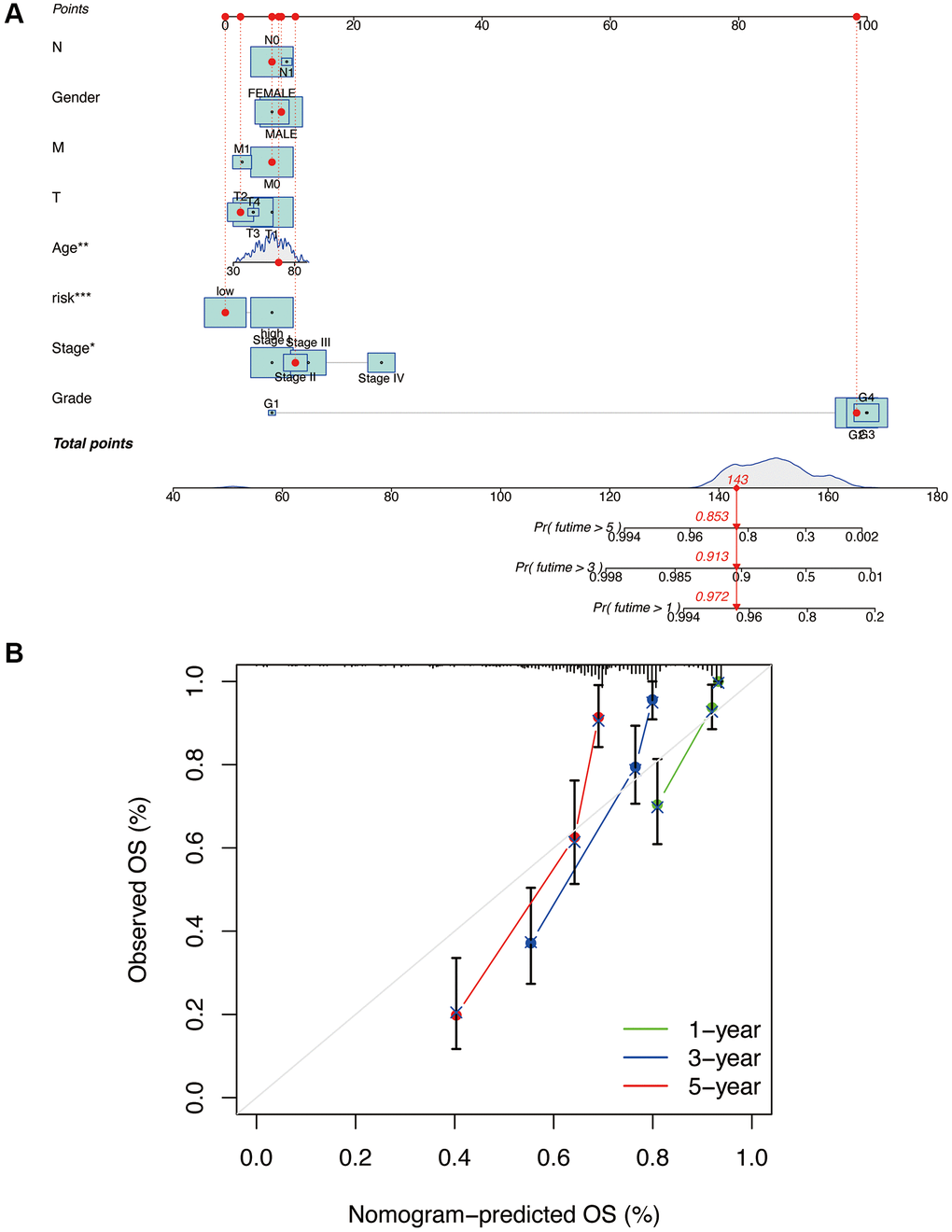 Based on the risk model and related clinical data, we constructed a nomogram (Figure 7A). We also generated calibration curves for the nomogram at 1, 3, and 5-year intervals (Figure 7B). It can be observed that the three curves are relatively close to the reference line, indicating that the nomogram can accurately predict the survival period of patients.