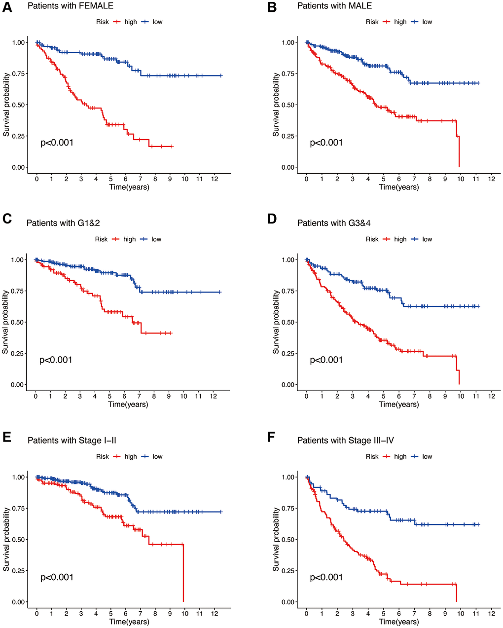 Using R software (“survivor”, “survminer” package), survival curves were plotted for patients of different genders, tumor grades, and tumor stages based on the risk model to verify the applicability of our constructed risk model to patients of different clinical trait groups.