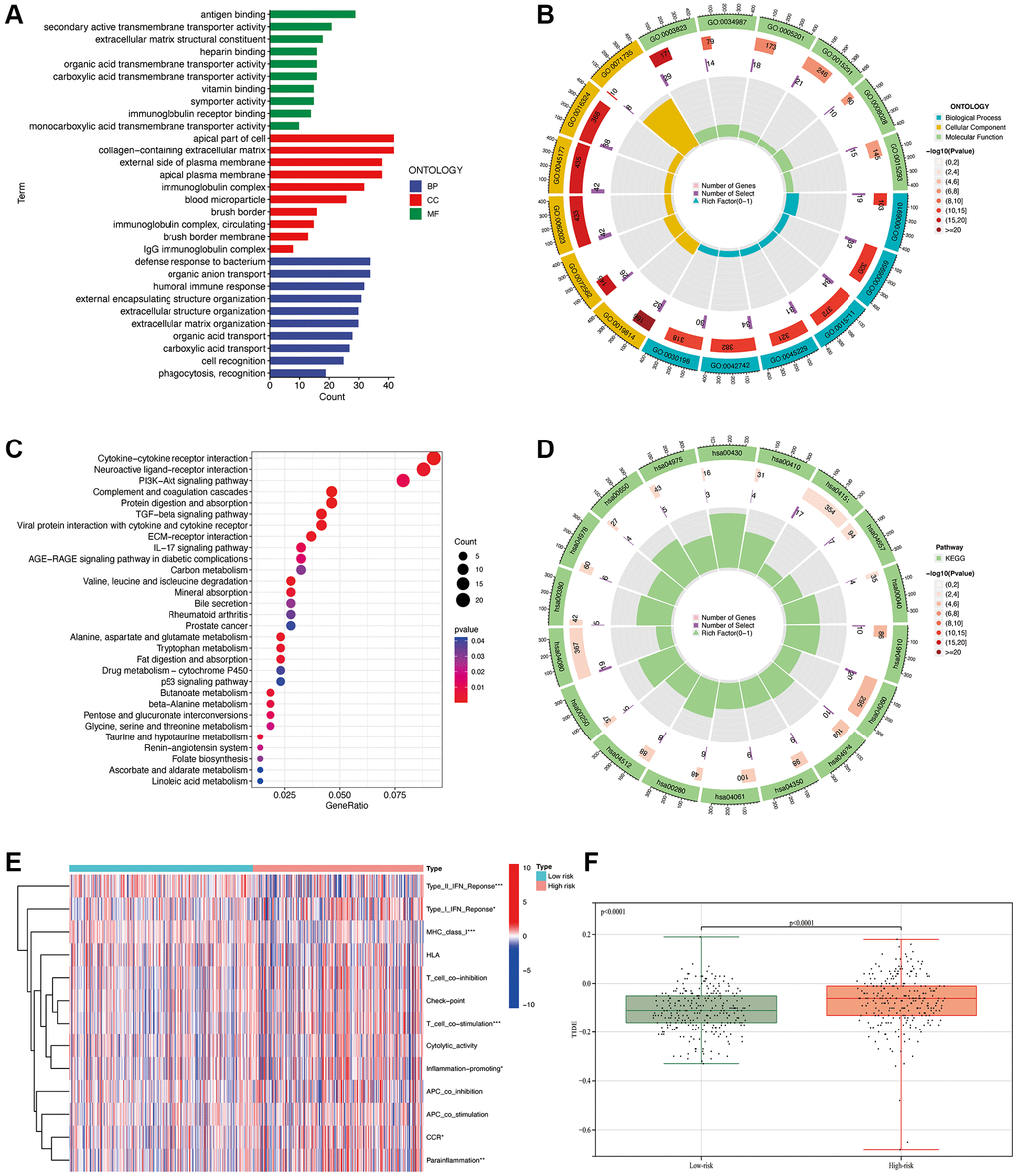 The bar plot of the GO analysis (Figure 9A) reveals that in terms of Molecular Function (MF), the main focuses are on antigen binding and secondary active transmembrane transponder activity. In Cellular Component (CC), the main focuses are on the apical part of the cell and the collagen-containing extracellular matrix. In Biological Process (BP), the main focuses are on the defense response to bacterium and organic anion transport. GO enrichment analysis bubble plot (Figure 9B): The outermost circle represents the GO enrichment IDs, the second circle represents the number of genes associated with each GO term, the third circle represents the number of differentially expressed genes enriched in each GO term, and the fourth circle represents the proportion of enriched genes. The redder the color, the more significant the enrichment of differentially expressed genes. From the figure, we can observe that the gene count enriched in the GO term “0071735” is the highest in proportion. For KEGG pathway analysis, the bar plot (Figure 9C) indicates that the highest enrichment and differential expression are primarily observed in pathways such as Cytokine-cytokine receptor interaction, Neuroactive ligand-receptor interaction, and PI3K-Akt signaling pathway. From the circular plot of the KEGG pathway analysis (Figure 9D), it is also evident that the results are primarily focused on hsa00430 and hsa04610. From the GSEA analysis (Figure 9E), it can be observed that there are significant differences between the high and low-risk groups in terms of Type_II_IFN_Reponse, Type_I_IFN_Reponse, MHC_class_I, T_cell_co_stimulation, Inflammation-promoting, CCR, and Parainflammation. The calculated TIDE values (Figure 9F) are significantly lower in the low-risk group compared to the high-risk group (p < 0.0001). This finding further indicates that our predictive model can effectively distinguish the immune escape capabilities of patients in the high and low-risk groups.