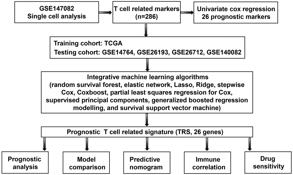 Our investigation identified T cell related markers in ovarian cancer by single cell analysis. Moreover, we constructed a machine learning algorithm-based T cells-related signature (TRS) using one TCGA dataset (training cohort) and four GEO datasets (testing cohort). Our result may offer more evidence regarding the vital roles of T cells in the clinical outcome and drug sensitivity in ovarian cancer.
