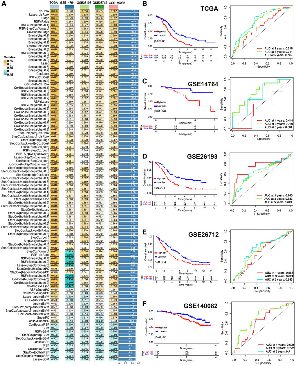 Based on 286 T cell-related markers, we performed univariate cox analysis and identified 26 potential prognostic biomarkers (Supplementary Table 2). These 26 potential prognostic biomarkers were submitted into integrative procedure including 10 machine learning methods, which could conduct a prognostic TRS. Figure 3A showed the C-index of 101 kinds of prediction models in all datasets. The plsRcox method-based model was referred as the best model and it had a highest average C-index being 0.60 (Figure 3A). And a final set of 26 T cell-related genes were used to construct the TRS (Supplementary Table 2). Classification of high and low-risk groups relied on the medium value of risk score was the cutoff. As expected, in TCGA cohort, high-risk score indicated a poor OS rate in ovarian cancer with an AUCs of 1-, 3-, and 5-year ROC curve being 0.616, 0.711 and 0.745, respectively (Figure 3B, p < 0.001). In testing cohort, the data indicated a poor clinical outcome in high-risk score group in GSE14764, GSE26193, GSE26712 and GSE140082 cohort (Figure 3C–3F, all p < 0.05). ROC analysis measured the discrimination of TRS, with 1-, 3-, and 5-year AUCs of 0.444, 0.759, and 0.681 in GSE14764 dataset; 0.745, 0.633, and 0.649 in GSE26193 dataset; 0.568, 0.624, and 0.653 in GSE26712 dataset; 0.629, and 0.73 in GSE140082 dataset, respectively (Figure 3C–3F). The risk score, survival status, and gene expression of TRS of all cohorts could be seen in Supplementary Figure 1A–1E.