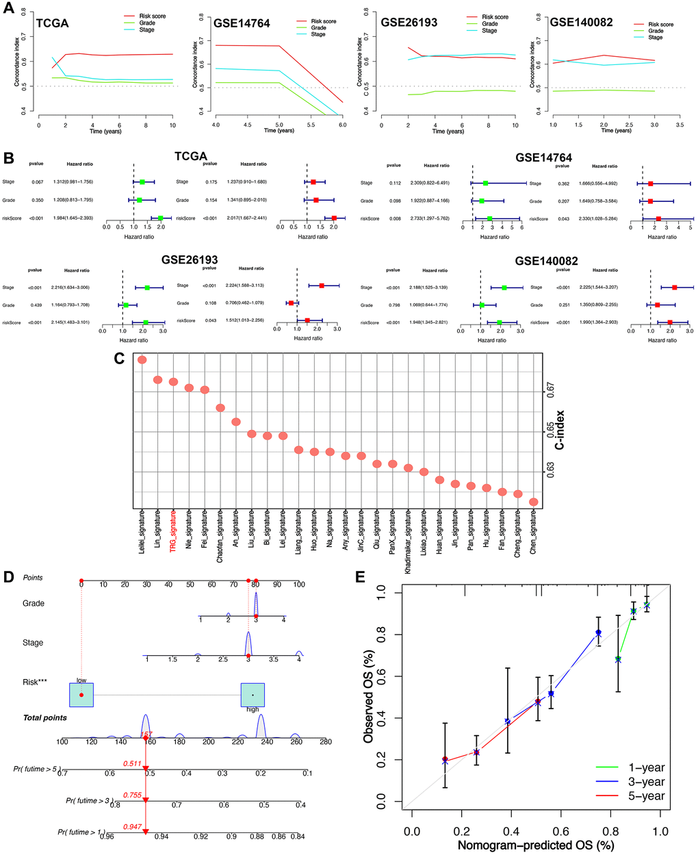 As shown in Figure 4A, compared with grade and FIGO stage, risk score had a highest C-index in all cohort. However, there was no clinical information in GSE26712 cohort. Moreover, risk score was a risk factor for the clinical outcome of ovarian cancer in all cohorts (Figure 4B). Supplementary Table 3 showed the C-index of our TRS and 25 random prognostic models () were also calculated. And the data showed that the C- index most of these prognostic signatures was lower than the current TRS (Figure 4C). These results suggested that our TRS had a better performance in evaluating the prognosis of ovarian cancer cases. Based on TRS, stage and grade, we then developed a survival prediction nomogram (Figure 4D, 4E), with which the clinicians could evaluate the clinical outcome of ovarian cancer patients.