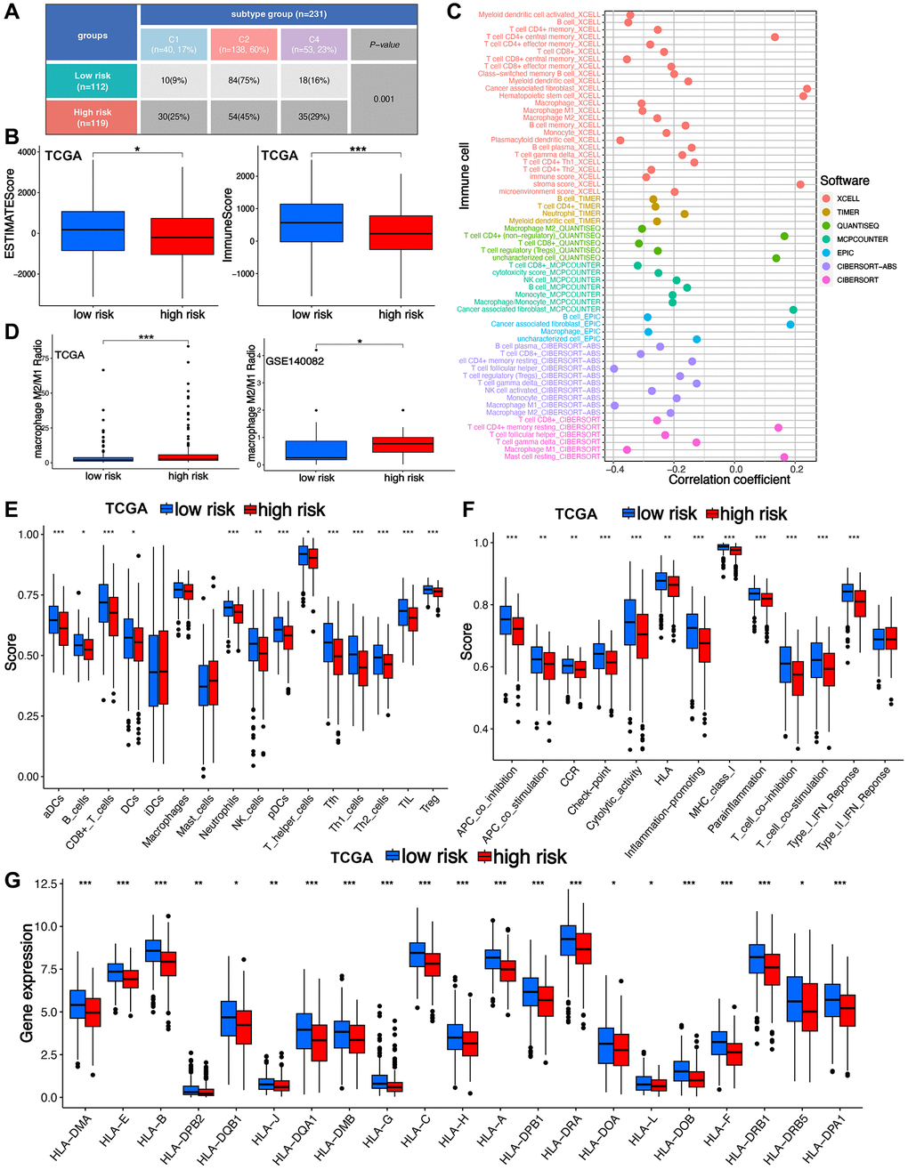 Study had suggested six types of tumor immune landscape [22]. Most of TCGA ovarian cancer cases were IFN-g dominant(C2) type and lymphocyte depleted(C4) type ranked a higher proportion in high-risk score group compared with low-risk score group (Figure 5A, p = 0.001). Further analysis suggested a higher ESTIMATE score and Immunes core in low-risk score group (Figure 5B, all p < 0.05). Moreover, risk score had a negative correlation with the abundance of most of immune cells (Figure 5C). The result of the current study showed that low-risk score indicated a lower level of s M2/M1 proportion in TCGA and GSE140082 cohort (Figure 5D). Moreover, ovarian cancer patients with high-risk score correlated a lower level of T cells, B cells, NK cells, Th1 cells, Th2 cells and neutrophils (Figure 5E). Ovarian cancer cases with high-risk score demonstrated a lower score of immune related functions in ovarian cancer, including cytolytic activity and inflammation promoting (Figure 5F, all p < 0.05). Further analysis revealed that high-risk score indicated a lower level of most of HLA-related genes (Figure 5G).