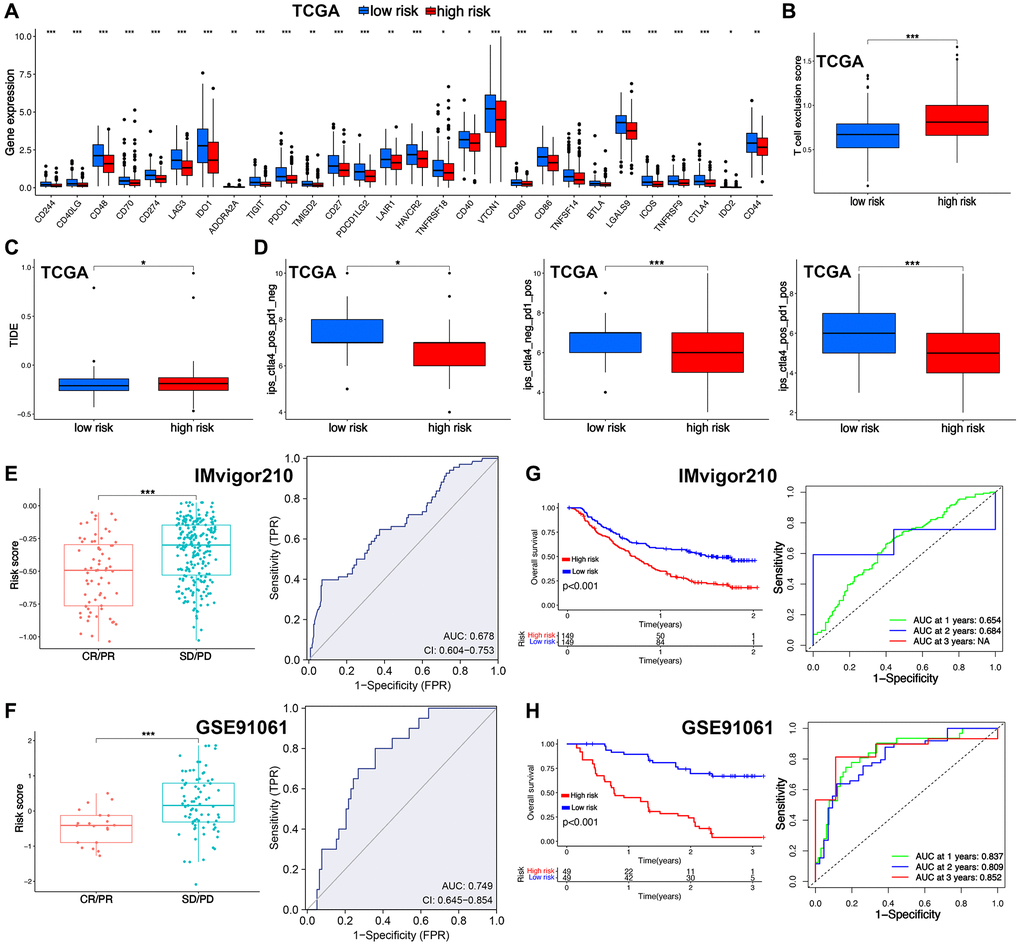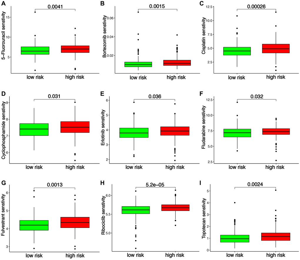 Several indicators were then used to assess the functions of TRS in predicting immunotherapy benefits in ovarian cancer. As shown in Figure 6A, higher expression of many immune checkpoints was found in low-risk score group (all p < 0.05). TIDE score and T cell exclusion score could predict the immunotherapy benefits [23, 24]. Low TIDE score and T cell exclusion score indicated a better response to immunotherapy. As shown in Figure 6B, 6C, low-risk score group had a lower T cell exclusion score in ovarian cancer and TIDE score (all p < 0.05). IPS was an indicator for predicting the response to immunotherapy [25]. Low-risk score group had a increased IPS of anti-CTLA4 and anti-PD1 (Figure 6D, p < 0.05). In IMvigor210 cohort and GSE91061 cohorts, low-risk score was obtained in patients in CR/PR group with an AUC of 0.678 and 0.749 in ROC curve (Figure 6E, 6F, p < 0.001). Moreover, high-risk score indicated a poor OS rate in IMvigor210 dataset and GSE91061 dataset, with 1-, 3-, and 5-year AUCs of 0.654, 0.684, and NA; and 0.837, 0.809 and 0.852, respectively. (Figure 6G, 6H). Chemotherapy and endocrinotherapy were important therapeutic measures for ovarian cancer. We also detected the IC5O value of common drugs in high and low-risk score groups. As shown in Figure 7A–7I, the IC50 values of 5-Fluorouracil, Bortezomib, Cisplatin, Cyclophosphamide, Erlotinib, Fludarabine, Fulvestrant, Ribociclib, Topotecan were higher in high-risk score group versus low-risk score group (all p < 0.05), demonstrated that low-risk score had a better response to chemotherapy, endocrinotherapy, target therapy in ovarian cancer.