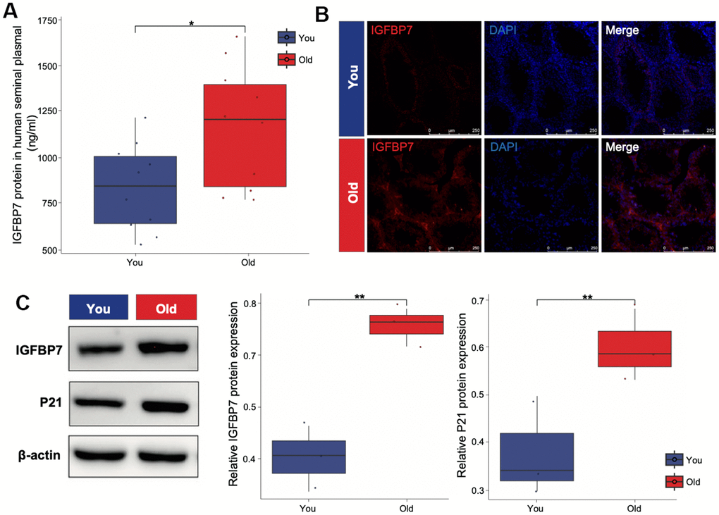 Senescent cells produce a series of profibrotic and proinflammatory factors, these factors are also known as SASP. IGFBP7 are important transcriptional inducers of the SASP. IGFBP7, derived from senescent cells, plays a crucial role in inducing senescence in young mesenchymal stem cells. To verify whether SASP such as IGFBP7 are secreted by Leydig cells and travel cross the seminal tubular basement membrane, we collected human seminal plasma from healthy donors and measured IGFBP7 protein levels. By using ELISA, we found that IGFBP7 protein could be detected in seminal plasma, and interestingly, seminal plasma IGFBP7 expression levels were higher in the older group than in the young group (Figure 3A). We also measured the location by immunofluorescence and expression level of IGFBP7 in the testes of C57/BL6 mice by Western blot. We found that IGFBP7 was mainly expressed in testicular interstitial compartment, and the level of IGFBP7 in the testes of mice in the older group was higher than that in the young group (Figure 3B, 3C), indicating that IGFBP7 may be a new biomarker of testicular aging.