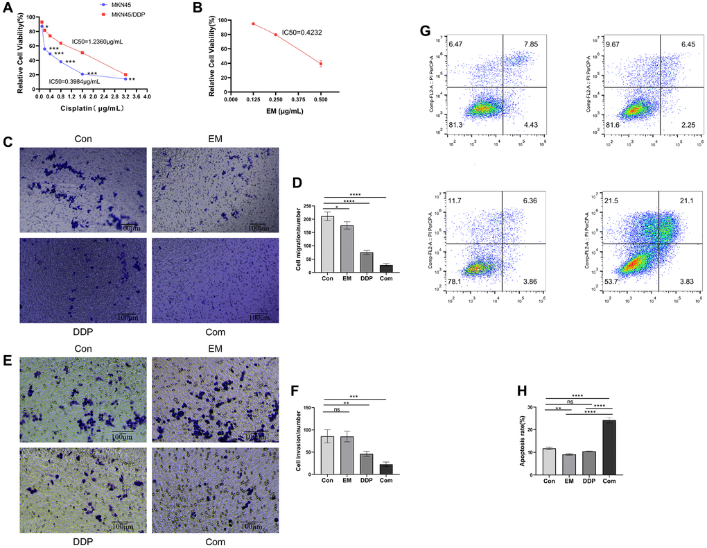 To further investigate the effects of EM in combination with DDP on MKN45/DDP cells, we used the Transwell assay to measure the migration ability of MKN45/DDP cells. The results showed a significant decrease in the number of migrated cells in all treatment groups compared to the control group (Figure 1C, 1D, P-value: 0.0247, < 0.0001), with the combination group exhibiting the most pronounced inhibitory effect. Additionally, we assessed the invasion ability of MKN45/DDP cells treated with EM in combination with DDP, and the results demonstrated a significant reduction in the number of invaded cells in both the DDP group and the combination group compared to the control group (Figure 1E, 1F, P-value: 0.0065, 0.0003), with the combination group showing a greater reduction in invaded cells. These findings indicated that the combined treatment of EM and DDP effectively inhibited the migration and invasion ability of MKN45/DDP cells.