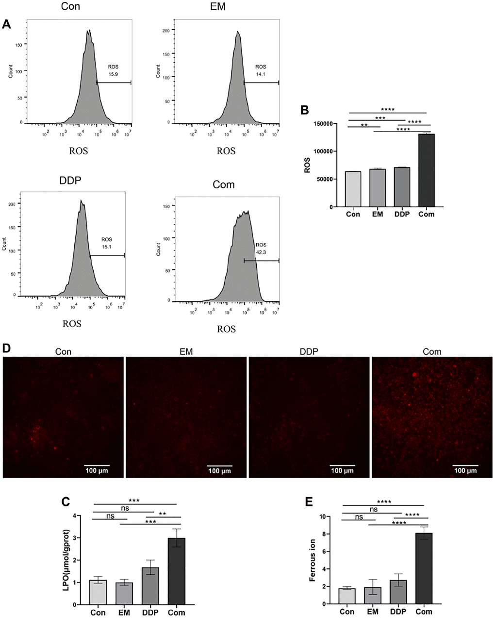 We examined the divalent iron ion levels in the cells of control, EM, and DDP, as well as combined groups using laser confocal and RhoNox-1 fluorescent probes, and the results are shown in Figure 2D, 2E. From the figures, we found that the fluorescence intensity in the cells of the combined group was greatly enhanced compared with that of the control group (P-value: < 0.0001), and the fluorescence intensity of the combined group was clearly higher than that of the EM group and the DDP group (P-value: < 0.0001). This result demonstrated that EM combined with DDP could promote the accumulation of divalent iron ions in gastric cancer cisplatin-resistant cells MKN45/DDP to a certain extent.