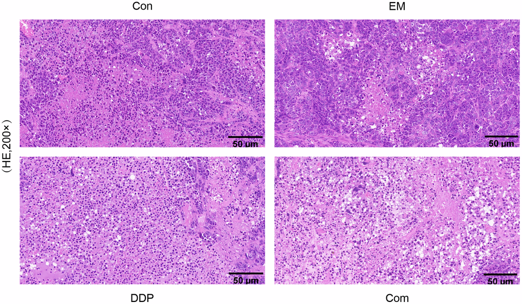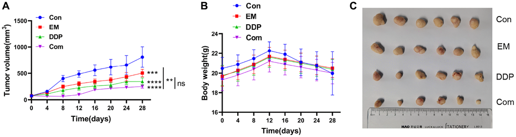 Furthermore, we administered the drug at the end of the treatment complete peeling of the nude mice in each group of tumor tissue (Figure 3C), it can be seen that it is round or round-like, brittle, hard, clear boundaries, and the surface of some of the tumor tissues are easy to break and bleed; measurement of the volume of the tumor in each group: it was found that the volume of the tumor was larger in the control group, but the volume of the tumor in the DDP group and the combined group were smaller, among which the volume of the tumor in the combined group was the smallest, which indicated that the treatment influence of EM combined with the DDP group was better.