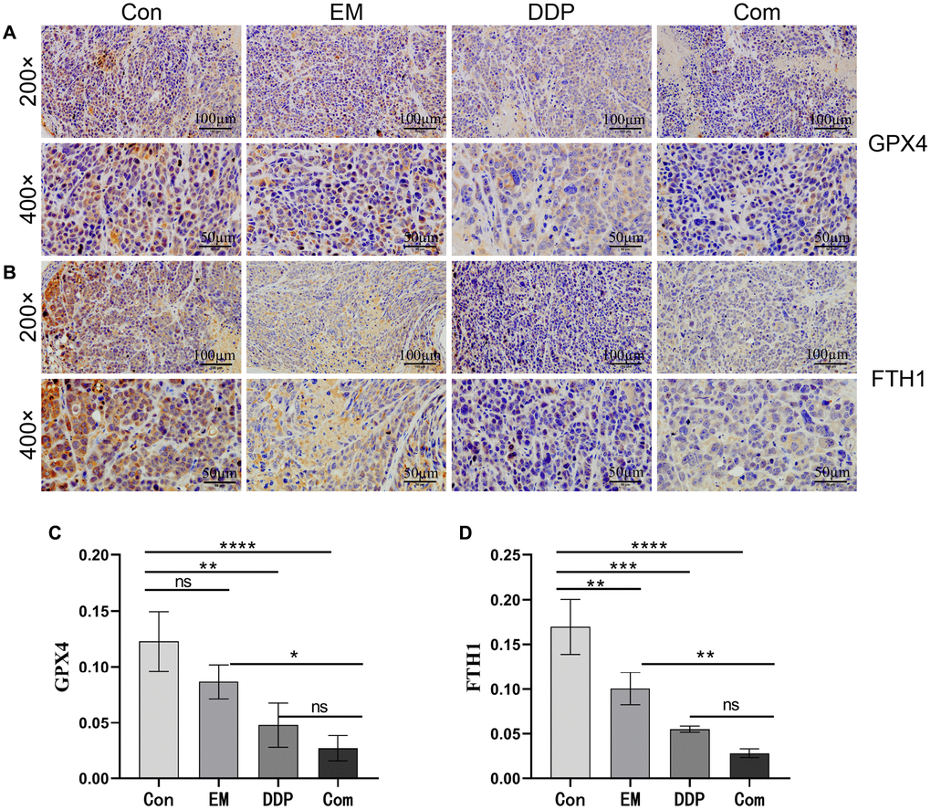 GPX4 and FTH1 are the symbols of iron death occurring in tumor cells. Therefore, we used immunohistochemistry to detect the effect of EM combined with DDP on the protein expression of GPX4 and FTH1. The positive expression of GPX4 and FTH1 was mostly concentrated in the cytoplasm or cell membrane, with brownish-yellow or brown granular color, and was mostly diffusely distributed in sheets in the field of view of the tissue. The results showed that (Figure 5A–5D) compared with the control group, the positive expression of GPX4 (P-value: 0.0059) and FTH1 (P-value: 0.0069, 0.0002) proteins in the EM group, the DDP group, and the combined group were reduced sequentially; At the same time, GPX4 (P-value: 0.0218) and FTH1 (P-value: 0.0053) in the combined group were lower than those in the EM group. The above results concluded that EM combined with DDP could play a role in inhibiting cisplatin resistance in gastric cancer nude mice by decreasing the expression of GPX4 and FTH1 proteins, thereby inducing cells to produce iron death.