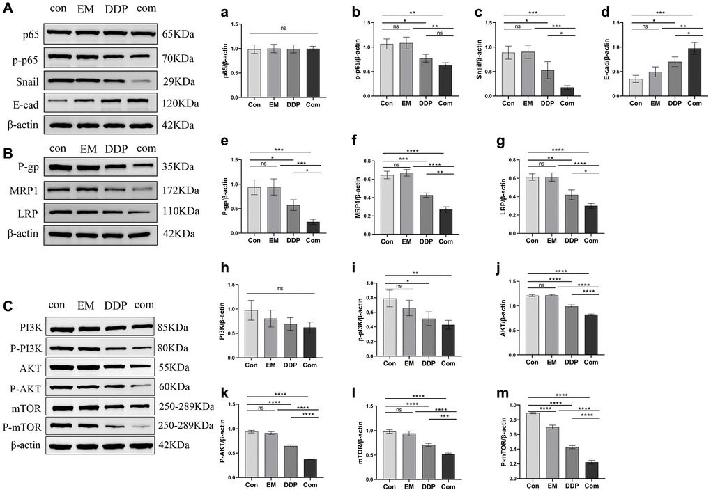 Moreover, the PI3K/AKT/mTOR pathway also has a critical position in tumor drug resistance. Our experimental results showed (Figure 7C, h–m) that both EM combined with DDP groups were able to significantly downregulate the levels of p-PI3K (P-value: 0.0074), AKT (P-value: < 0.0001), p-AKT (P-value: P-value: < 0.0001), mTOR (P-value: < 0.0001), and p-mTOR (P-value: < 0.0001) protein expression compared with the control group; The Com group was able to further downregulate AKT (P-value: < 0.0001), p-AKT (P-value: < 0.0001), mTOR (P-value: < 0.0001, 0.0010), p-mTOR (P-value: < 0.0001) protein expression levels compared to the EM and DDP monotherapy groups. EM combined with DDP slightly downregulated the total protein expression level of PI3K; But the difference was not statistically significant (P > 0.05).