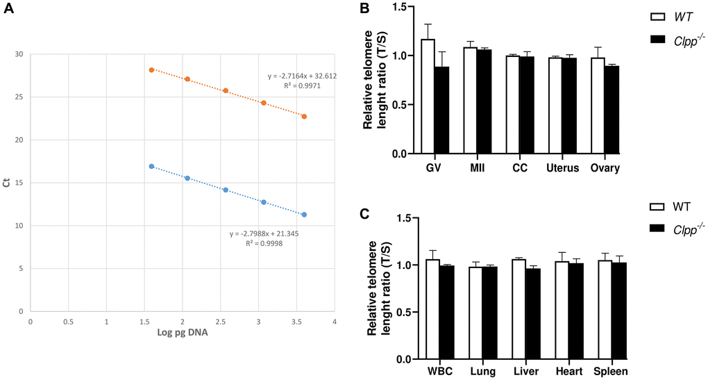 GV and MII stage oocytes (collected from 10 mice for each genotype at each timepoint, and pooled as 2 mice per sample) were collected from 2-, 6-, and 9-month-old Clpp−/− mice and compared to WT. DNA extraction from oocytes and cumulus cells was performed using the QIAmp DNA Micro Kit (Qiagen, Valencia, CA, USA), and DNA extraction from white blood cells (WBC) was conducted with DNA Isolation Kit for Mammalian Blood (Roche, Basel, Switzerland) according to manufacturer’s protocol and both concentrations were quantified using Qubit 3.0 (Life Technologies).