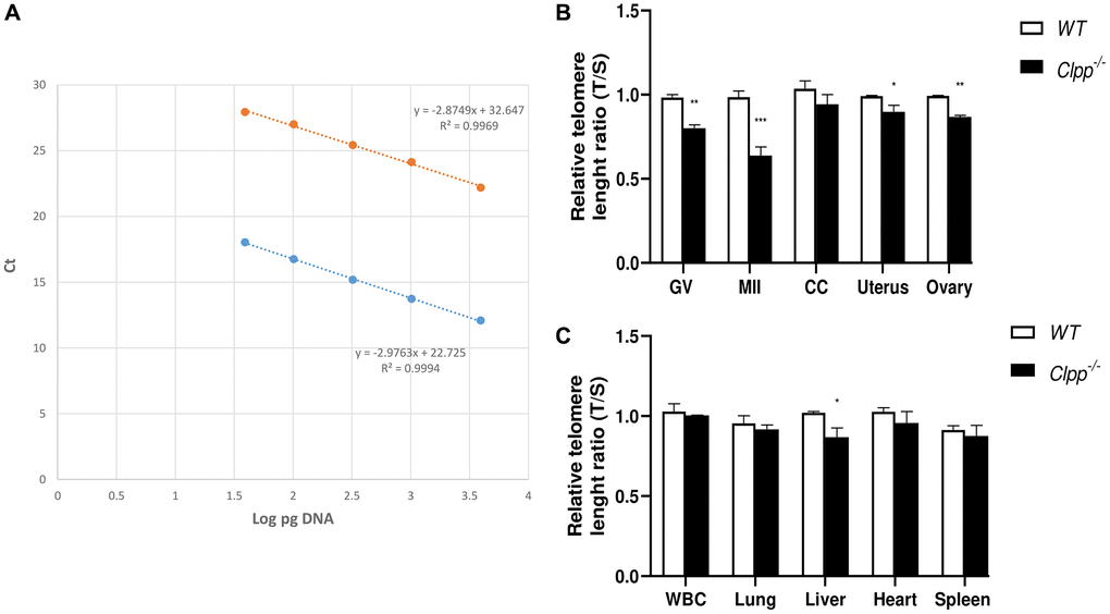 In 9-month-old mice, telomere length in GV and MII oocytes was also significantly shorter in Clpp−/− mice compared to WT (1.0 ± 0.07 vs. 0.84 ± 0.05, p = 0.01 and 0.99 ± 0.04 vs. 0.89 ± 0.02, p = 0.01, respectively) (Figure 3A, 3B). In somatic tissues, telomere length was significantly shorter in the uterus (1.14 ± 0.03 vs. 1.01 ± 0.03, p = 0.01), ovary (1.06 ± 0.04 vs. 0.79 ± 0.01, p = 0.004), liver (1.03 ± 0.02 vs. 0.90 ± 0.06, p = 0.01) and spleen (0.98 ± 0.01 vs. 0.88 ± 0.02, p = 0.01). Conversely, while the mean telomere length was also lower in CCs, WBCs, lung, and heart in Clpp−/− mice compared to WT, the difference was not statistically significant (Figure 3B, 3C). The telomere length assessment was repeated twice, using five mice (ten GV for each) in each group per experiment.