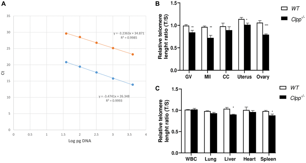 It is noteworthy that we found telomere length to be shorter in the liver and spleen of 9-month-old Clpp-deficient mice compared to WT, while the difference did not reach statistical significance in samples of lung and heart. Clpp is predominantly expressed in tissues that have an active metabolism and contain a higher number of mitochondria such as the skeletal muscle and liver [40], whereas it is detected at lower levels in lung and kidney. It is plausible that mitochondrial dysfunction in tissues where CLPP is most abundant is more likely to result in shortened telomeres.