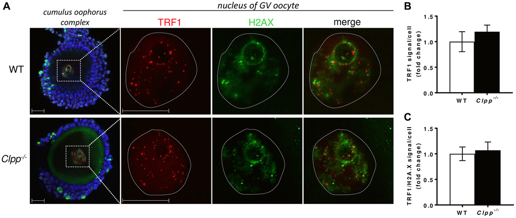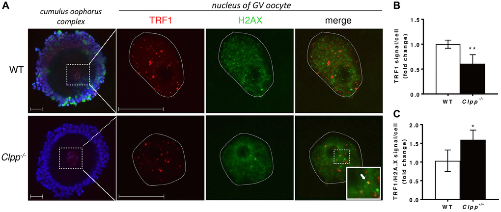 For immunofluorescent staining, cumulus oophorus complexes (COCs) containing GV stage oocytes were collected and fixed with 4% paraformaldehyde (Sigma, St. Louis, MO, USA) in Dulbecco’s Phosphate Buffer Saline (DPBS) for 5 min, then washed three times in 1X DPBS. They were placed in 0.5% Triton X-100 in DPBS at room temperature for 10 minutes, then washed in DPBS for 5 minutes. After blocking in 3% BSA (Sigma, St. Louis, MO, USA) at room temperature for 1 h, COCs were incubated overnight at 4°C with rat anti-TRF1 monoclonal antibody (Abcam, Cambridge, UK Cat# ab192629, 1:100) or mouse anti-H2AX monoclonal antibody (Sigma, St. Louis, MO Cat# 05-636-25UG 1:100) as a primary antibody. After three washes with 1X DPBS for 10 minutes, COCs were incubated with Alexa Fluor 488-conjugated goat anti-mouse antibody (1:400) or Alexa Fluor 568-conjugated goat anti-rat antibody (1:400) for 1 h at room temperature. Finally, they were mounted with 4′,6-diamidino-2-phenylindole (DAPI;1:1000) (Life Technologies, Carlsbad, CA, USA) on glass slides and stored at 4°C until imaging. Images were captured on Leica SP8 spectral scanning confocal microscope.