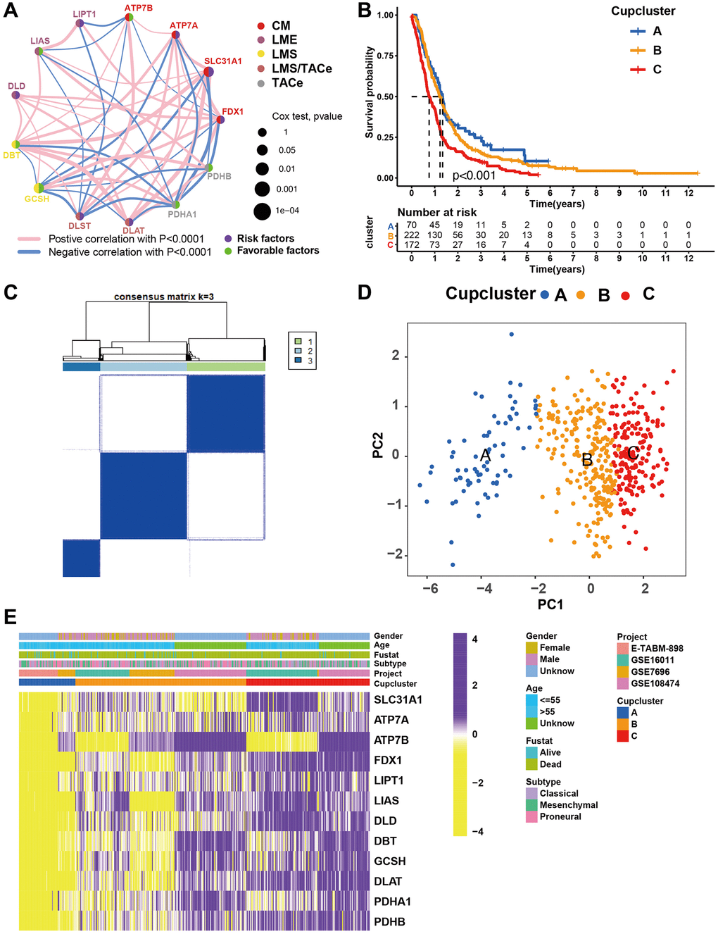 Three regulated genomic phenotypes (cuproptosis gene clusters A, B and C) were determined by clustering analysis of the phenotype-related DEGs.