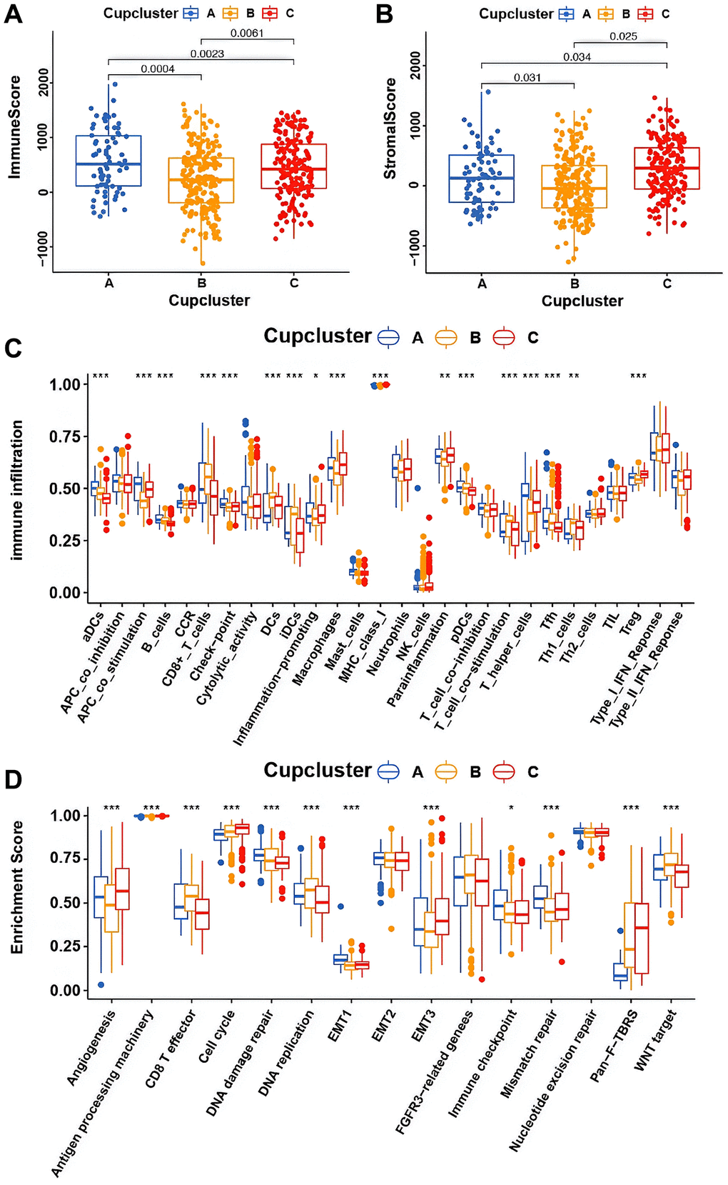 Four datasets (GSE7696, GSE16011, GSE108474, and ArrayExpress-E-TABM-898) were used to identify three distinct cuproptosis regulation patterns based on the 13 cuproptosis regulators using the unsupervised clustering method (Figure 2C). There was a significant difference in the cuproptosis transcriptional profile among the three cuproptosis regulation patterns (Figure 2D). Prognostic analysis revealed that among those in Cupcluster A, B, and C, patients in Cupcluster C showed the worst survival performance (p < 0.001; Figure 2B). Cuproptosis regulators differ significantly in three distinct modes of regulation. The regulators of cuproptosis were most highly expressed in Cupcluster C patients and least expressed in Cupcluster A patients (Figure 2E), which indicated that the Cupcluster C group may have an active cuproptosis phenotype. The results of the ESTIMATE algorithm showed that Cupcluster A exhibited a high immune score and that Cupcluster C had a high stromal score (Supplementary Table 4), which meant that Cupcluster A may have significantly increased immune cell infiltration, and Cupcluster C has a pro-tumorigenic phenotype (Figure 3A, 3B). Analyses of TME cell infiltration revealed that CupCluster A was significantly enriched in immune cell infiltration, including macrophages, dendritic cells, B cells, and antigen-presenting cell stimulation (Figure 3C). We hypothesize that the diverse immune cells enriched in Cupcluster A tumours may inhibit the initiation and progression of cancer, thereby exhibiting a distinct survival advantage. Immune cell-rich tumours have been shown to have distinct survival advantages [25–27]. A GSVA enrichment analysis was used to further explore the biological characteristics of each pattern (Supplementary Table 5). Cupcluster A showed enrichment in immune activation-related pathways such as antigen processing and presentation, extracellular matrix receptor interaction, and leukocyte transendothelial migration (Supplementary Figure 2A). Cupcluster C was markedly enriched in metabolic activation pathways, including citrate cycle, TCA cycle, cuproptosis, and nucleotide sugar metabolism (Supplementary Figure 2B). Cupcluster B was enriched in the immunometabolism pathway. Subsequent analyses revealed that the CupCluster C regulatory pattern was significantly associated with stromal activation, including angiogenesis, EMT, and transforming growth factor beta, which was consistent with the shorter survival in CupCluster C (Figure 3D). The specific correlation between each TME infiltrating cell type and each cuproptosis regulator was examined using Spearman’s correlation analysis (Supplementary Figure 3B). We focused on FDX1, as an important cuproptosis regulator, which was negatively correlated with immune score (Supplementary Figure 3A) and revealed its relationship with TME infiltrating immune cells using the ESTIMATE algorithm (Supplementary Figure 3C). The results showed that FDX1 expression affected the infiltration of a small number of immune cells. Therefore, we hypothesised that FDX1 may be involved in regulating tumour progression through metabolic pathways rather than the surrounding immune microenvironment. Based on the above analysis, we unexpectedly found that the three cuproptosis regulation patterns had significantly different biological characteristics. Cupcluster A was classified as an immunoinflammatory phenotype characterised by increased immune cell infiltration, Cupcluster B was classified as an immunometabolism-deficient phenotype characterised by the absence of immune cell infiltration and metabolic activity, and Cupcluster C was classified as a metabolically active phenotype characterised by high stromal activity.