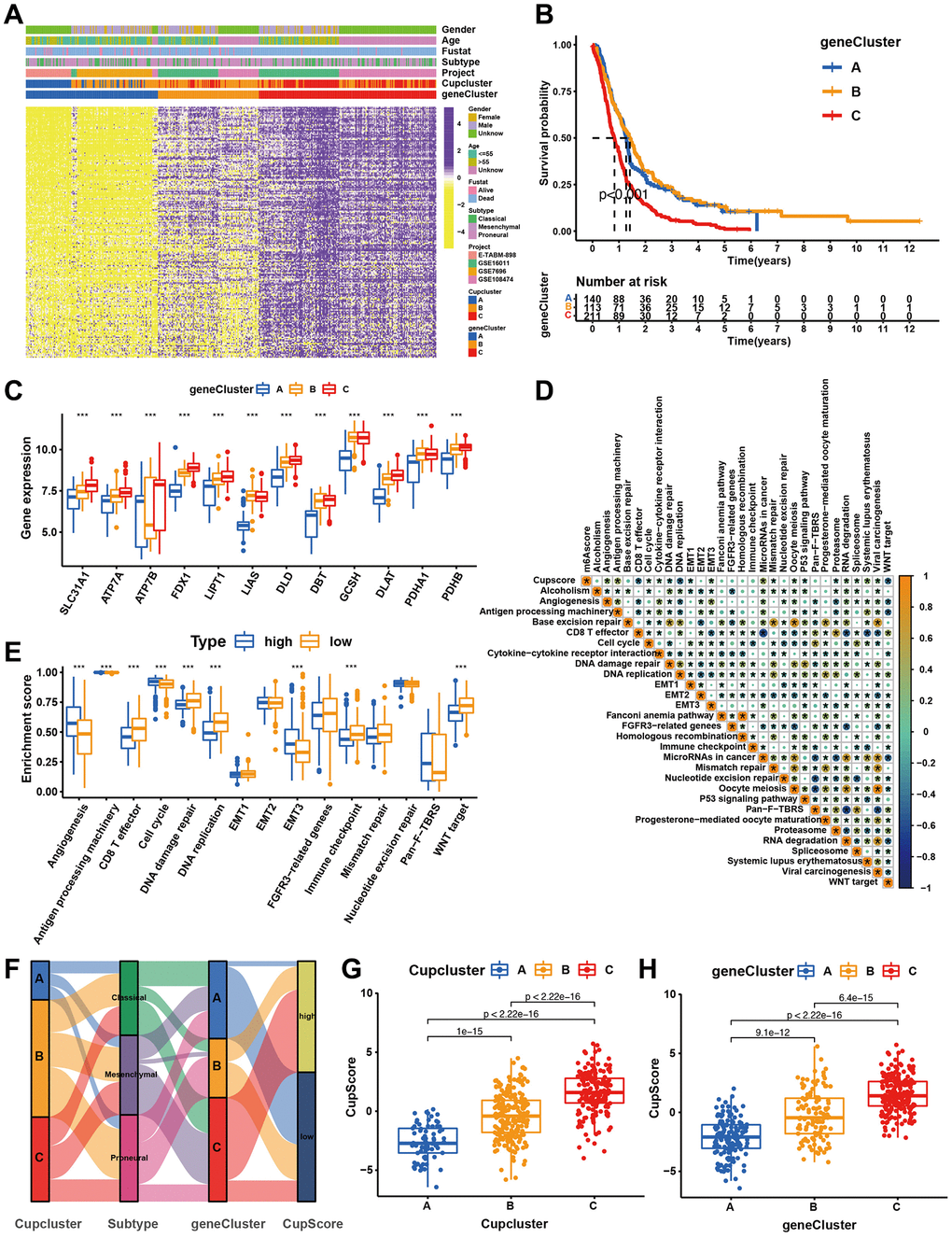 To further investigate the potential biological characteristics of each cuproptosis regulatory phenotype, 272 cuproptosis pattern-related DEGs were identified using the limma package (Supplementary Figure 4A). GO and KEGG enrichment analyses of DEGs revealed that these significantly enriched biological processes were associated with cuproptosis metabolism and immunity, which again demonstrated that the cuproptosis regulation phenotype plays a non-negligible role in the TME (Supplementary Figure 4C, 4D). The DEGs were prognostically filtered to 205 genes using univariate Cox regression analysis (Supplementary Table 6). To verify this regulatory mechanism, unsupervised clustering analysis was used to classify patients into distinct genomic subtypes based on the acquired 205 cuproptosis phenotype associated DEGs. The analysis revealed three distinct cuproptosis-regulated genomic phenotypes (cuproptosis gene clusters A-C) (Supplementary Figure 4B). We observed that patients with GBM in the cuproptosis gene cluster C exhibited more mesenchymal subtypes and death status than those in the cuproptosis gene clusters A and B. The opposite pattern was observed in cuproptosis gene clusters A and B. Patients with survival status or proneural subtype were mainly clustered in cuproptosis gene cluster A (Figure 4A). Survival analysis also showed that among the patients in the cuproptosis gene clusters A, B, and C, those in the cuproptosis gene cluster C exhibited the worst survival (Figure 4B). Most of the cuproptosis regulators were highly expressed in cuproptosis gene cluster C (Figure 4C). To further explore the function of the distinct cuproptosis gene clusters A-C, we examined other known signatures in patients with GBM (Supplementary Table 7). The results also showed that gene cluster A was significantly associated with immune activation states, and gene cluster C was characterised by stromal activation and cancer promotion (Supplementary Figure 4E). The above analyses have shown important roles for cuproptosis regulators in shaping the surrounding landscape of GBM. However, these analyses were based on patient populations and did not accurately assess the mode of cuproptosis regulation in individual patients. To further explore the heterogeneity and complexity of cuproptosis regulators in individual tumours, we constructed a scoring system, CupScore, for cuproptosis regulatory patterns in individual GBM patients. A total of 469 patients with GBM were randomly allocated to the training and validation cohorts. A total of 205 cuproptosis phenotype-related DEGs were subjected to LASSO regression followed by PCA (Supplementary Figure 5A, 5B and Supplementary Table 8). With a cutoff value of 0.3054, patients were divided into low- or high-CupScore groups in the training and validation sets. Patients with a low CupScore showed a prominent survival benefit (Supplementary Figure 5C, 5D). The CupScore was confirmed to be a robust and independent prognostic biomarker for GBM in univariate and multivariate Cox regression analyses (Supplementary Figure 5E, 5F). The ROC curve further demonstrated the ability of the CupScore signature to predict patient outcomes (Supplementary Figure 5G, 5H). Dramatic changes in the attributes of individual GBM patients were observed in the alluvial diagram (Figure 4F). We explored the association between CupScore and known signatures using both correlation analyses (Figure 4D). Analysis of relevant pathway activities showed that low CupScore in patients with GBM was associated with Wnt and CD8 T pathways, whereas high CupScore was related to enhanced activation of angiogenesis and EMT pathways (Figure 4E). The Kruskal–Wallis test revealed that CupScore was the lowest in Cupcluster A and highest in Cupcluster C (Figure 4G). Similarly, CupScore was lowest in gene cluster A and highest in cluster C (Figure 4H). These results strongly suggest that a low CupScore could be associated with immune activation, whereas a high CupScore could be associated with stromal activation. Patients with a high CupScore showed a poor survival benefit. Therefore, CupScore provides a better assessment of cuproptosis regulation patterns for individual tumours.