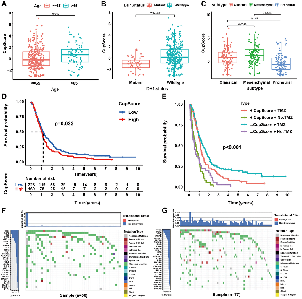 We further explored the relationship between cuproptosis regulation modalities and clinical traits, mutant phenotypes, and molecular subtypes through correlation analysis of the CupScore system in TCGA and CGGA cohorts. We found that older patients (Figure 5A), IDH wild-type patients (Figure 5B), and mesenchymal subtype (Figure 5C) patients were significantly associated with a higher CupScore, implying that these patients may be ascribed a Cupcluster-C modification pattern and stromal activation phenotype with worse clinical outcomes. Using the same cutoff value, patients were divided into low or high CupScore groups, with 223 and 160 patients, respectively. Kaplan-Meier curves indicated that low CupScore was markedly related to the overall survival of 383 patients in the merged cohort (Figure 5D). We examined the ability of the CupScore signature to predict the efficacy of adjuvant chemotherapy (TMZ) in GBM patients. We found that patients with a low CupScore showed a significant treatment advantage among those who received TMZ (Figure 5E). Interestingly, we were surprised to find that the predictive ability of the CupScore was not disturbed by adjuvant chemotherapy, with or without TMZ, and the low CupScore group exhibited a significant survival advantage (Figure 5E). The maftools package was used to show the distribution differences of somatic mutations between low and high CupScores in TCGA-GBM. We found that the high CupScore group presented a slightly higher tumour mutation burden than the low CupScore group, with the rate of the 5th most significantly mutated gene being 17% versus 12% (Figure 5F, 5G). The above results indicated that the CupScore could also be used to evaluate certain clinical characteristics of patients, such as older age, wild-type IDH, and molecular subtypes.