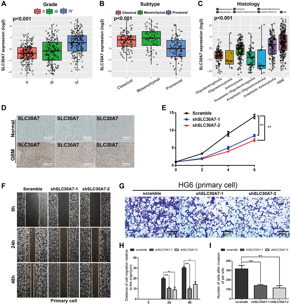 Disruption of zinc homeostasis has been found to be causally associated with tumorigenesis in various cancer patients [28]. As a Golgi located zinc transporter, SLC30A7 exhibits anti oxidative stress effect and induced apoptosis via the NFE2L2/HMOX1 pathway under high glucose (HG) conditions (32949653). SLC30A7 may be involved in tumour initiation and progression [29]. But there are few reports about SLC30A7 in gliomas. To explore the prognostic value of SLC30A7 in gliomas, public databases were used to analyzed SLC30A7 expression. SLC30A7 was increased in higher WHO grade, mesenchymal subtype and GBM histology (Figure 7A–7C). GBM patients with high SLC30A7 expression possessed a shorter survival (Figure 6H). Immunohistochemistry (IHC) analysis revealed that SLC30A7 was upregulated in GBM tissues than normal tissues (Figure 7D). To investigate the oncogenic role of SLC30A7 in glioma cells, SLC30A7-silenced cell models was constructed by transfecting siRNAs into DT001 cells (Figure 7H, 7I). CCK-8 and wound-healing and Transwell assay verified that silencing SLC30A7 significantly attenuated the proliferation, migration, and invasion of glioma cells (Figure 7E–7G). These data suggest that SLC30A7 may regulate the EMT process to facilitates malignant behavior in GBM cells.