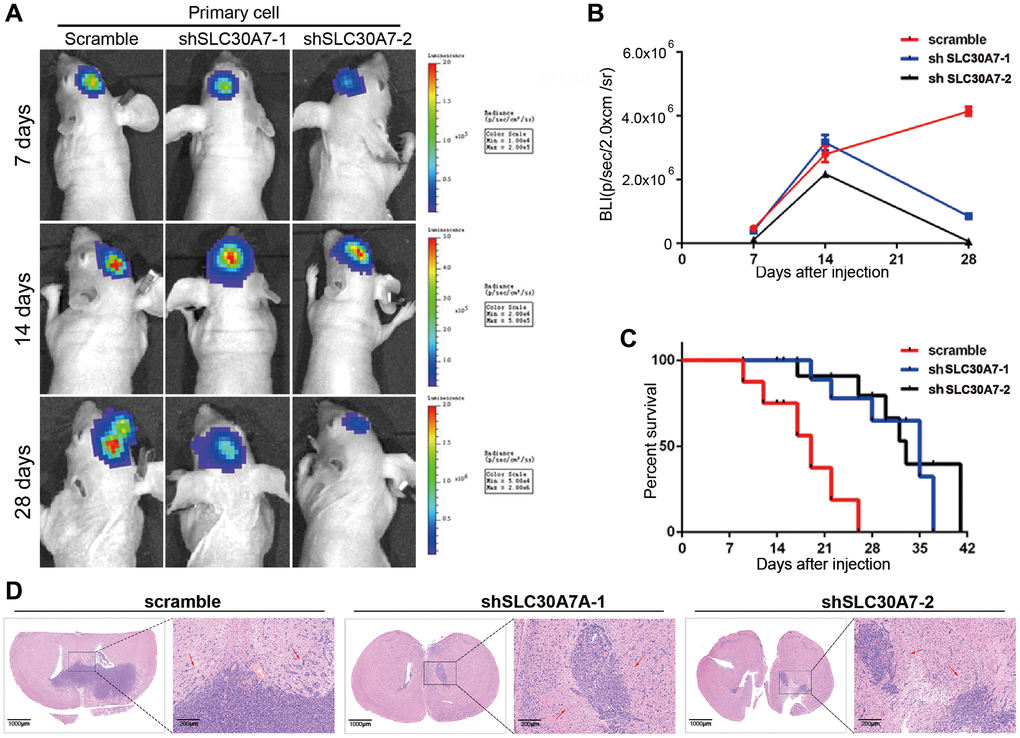 Primary cells were used to establish a model of intracranial tumour in Female nude mice, refer to previous studies for details [23]. The cells stably transfected with SLC30A7 related lentivirus were divided into three groups as Scramble, shSLC30A7-1 and SLC30A7-2. These cells that had been transfected with luciferase encoding lentivirus (GeneChem, China) were stereotaxically injected into the intracranial of mice (n = 6 in each group) to establish tumour models. At day 7, 14, and 28, intracranial tumour size was assessed using the IVIS spectral real-time imaging system (Blandford, USA). For HE, mice brains were immobilized in 4% paraformaldehyde and then embedded in paraffin.
