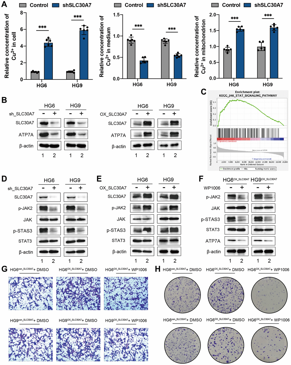 To investigate the function of SLC30A7 as a novel cuproptosis regulator in GBM, the concentration of copper in the cell fraction and medium was analyzed. Knockdown of SLC30A7 led to an increase of copper in cytoplasm and mitochondria, but a decrease in medium (Figure 9A), suggesting that SLC30A7 affected copper homeostasis in GBM cells. Knockdown of SLC30A7 decreased ATP7A levels and SLC30A7 overexpression increased ATP7A levels (Figure 9B). The GSEA analysis showed that SLC30A7 was significantly enriched in the JAK-STAT signaling pathway (Figure 9C). Importantly, Knockdown of SLC30A7 decreased phosphorylated (p)-JAK2 and p-STAT3 levels (Figure 9D), and SLC30A7 overexpression increased p-JAK2 and p-STAT3 levels (Figure 9E). JAK2 inhibitor WP1006 reversed SLC30A7-induced APT7A in HG6 and HG9 cells (Figure 9F). In addition, Inhibition of JAK2/STAT3 signaling prevented SLC30A7-induced proliferation and migration in GBM cells overexpressing SLC30A7 (Figure 9G, 9H). These data demonstrate that SLC30A7 suppressed cuproptosis through the JAK2/STAT3/ATP7A pathway.