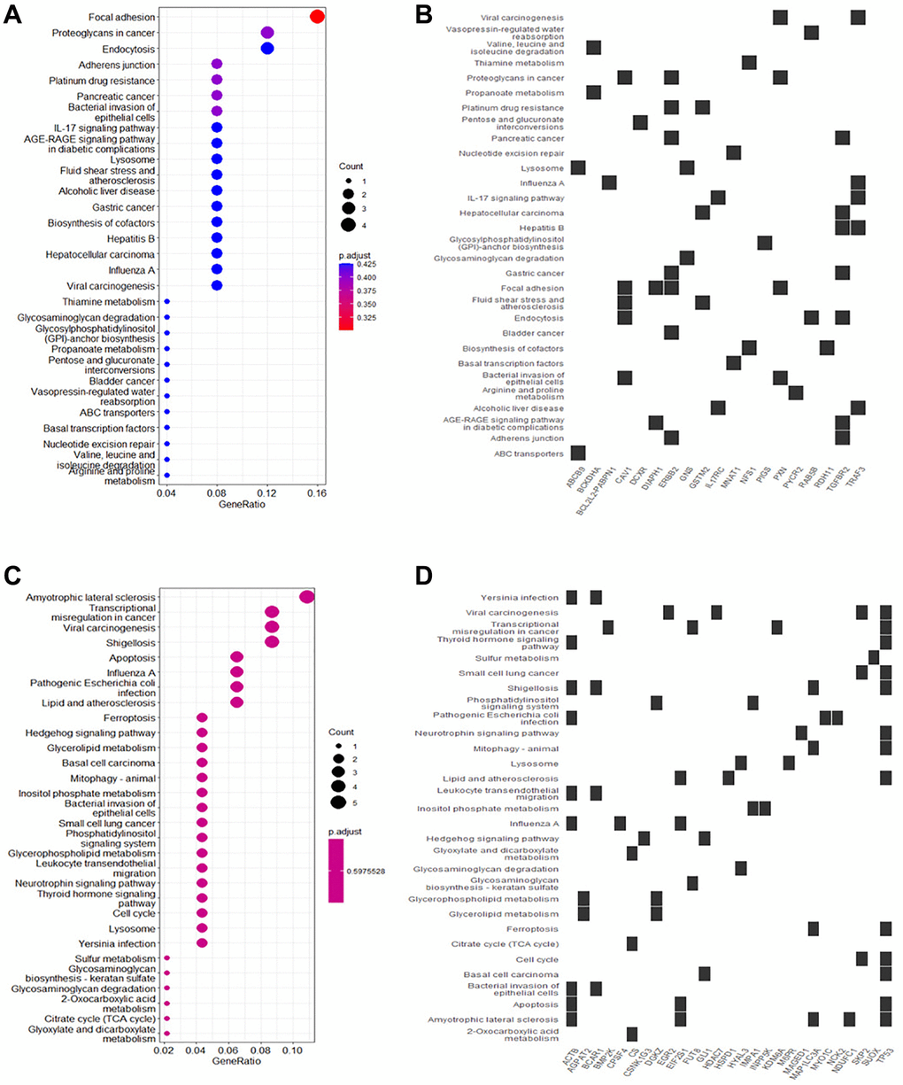 KEGG pathway analysis showed that upregulated DEGs in rutin-treated MSCs during osteogenic differentation were mainly enriched in focal adhesion, adherens junction, IL-17 signaling pathway, and AGE-RAGE signaling pathway in diabetic complications (Figure 4A, 4B). Additionally, the downregulated DEGs were enriched in ferroptosis, transcriptional misregulation in cancer, Hedgehog signaling pathway, and apoptosis (Figure 4C, 4D). Further analysis of the enrichment data showed that TP53 is a key gene regulated by rutin, and is involved in the regulation of multiple pathways (Figure 5A).