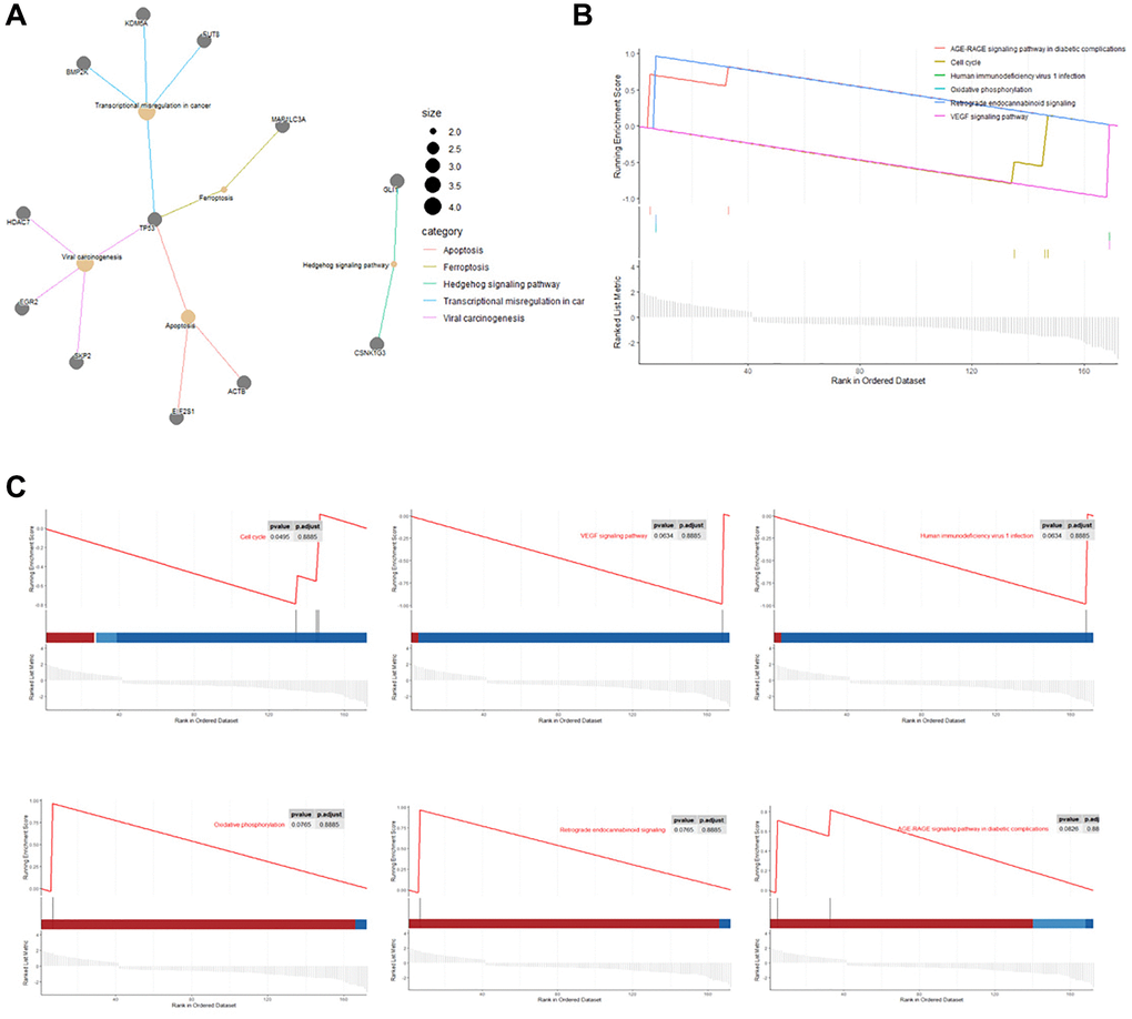 Gene set enrichment analysis (GSEA) showed that the DEGs that were mainly enriched in cell cycle, VEGF signaling pathway, human immunodeficiency virus one infection, oxidative phosphorylation, retrograde endocannabinoid signaling, and AGE-RAGE signaling pathways in diabetic complications (Figure 5B, 5C).