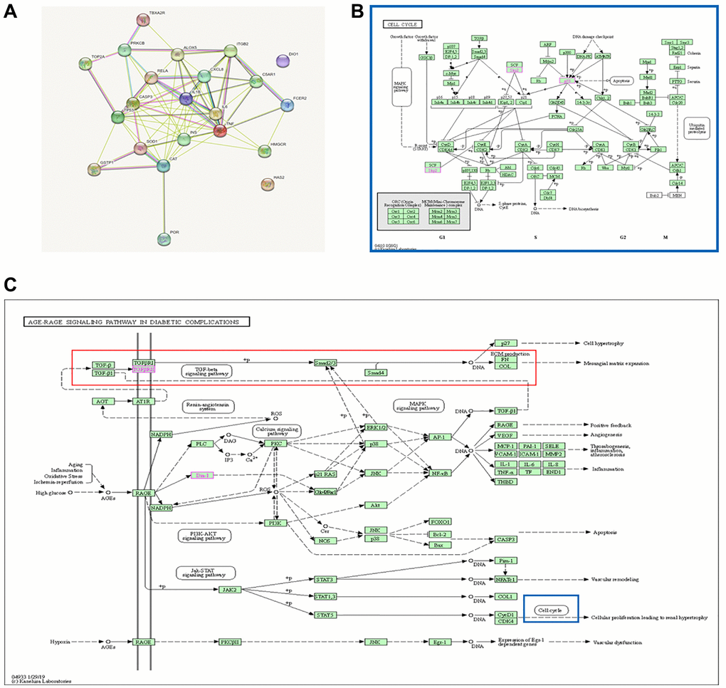 The keyword “Rutin” was searched on the Traditional Chinese Medicine Systems Pharmacology Database (TCMSP) (https://tcmsp-e.com/tcmsp.php) to identify potential targets of rutin. In total, 21 potential targets of rutin were identified in the TCSMP database. The 21 potential targets and the key gene TP53 were imported into the STRING database, resulting in 22 protein interactions. Notably, there was a strong association between TP53, CASP3 (caspase-3), and RELA (p65), which are the potential targets of rutin (Figure 6A). KEGG enrichment analysis showed that the 22 genes were mainly involved the AGE-RAGE signaling pathway in diabetic complication pathways. The AGE-RAGE signaling pathway in diabetic complication pathways mainly affects ECM deposition, and among them cell cycle regulation by TP53 is also involved (Figure 6B, 6C).