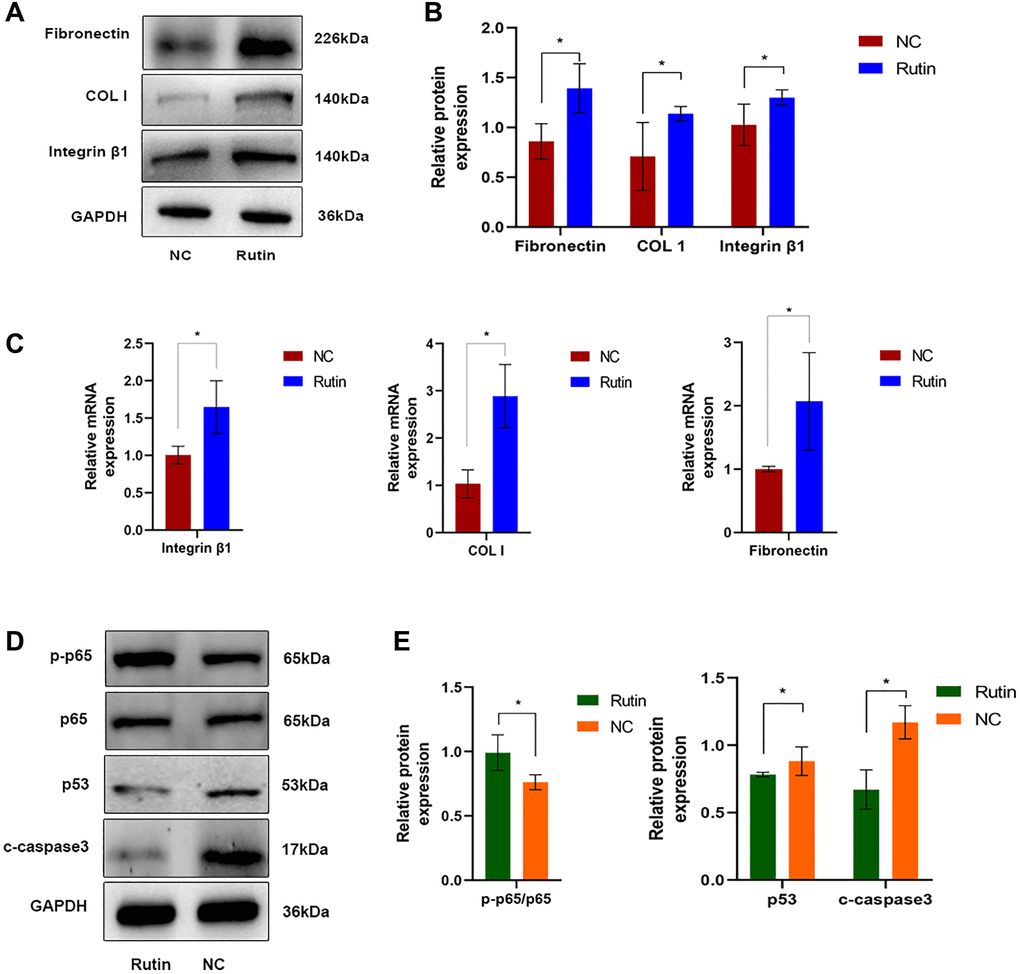 To further investigate the mechanisms through which rutin regulates osteogenic differentiation of MSCs, cells were treated with rutin, and the expression of ECM related genes were examined. Rutin treatment promoted ECM deposition (fibronectin and COL-I) and integrin β1 (affecting cell adhesion and migration) during osteogenic differentiation of MSCs (Figure 7A–7C). Additionally, western blotting showed that rutin treatment promoted p65 phosphorylation and inhibited p53 expression and caspase-3 cleavage (Figure 7D, 7E).