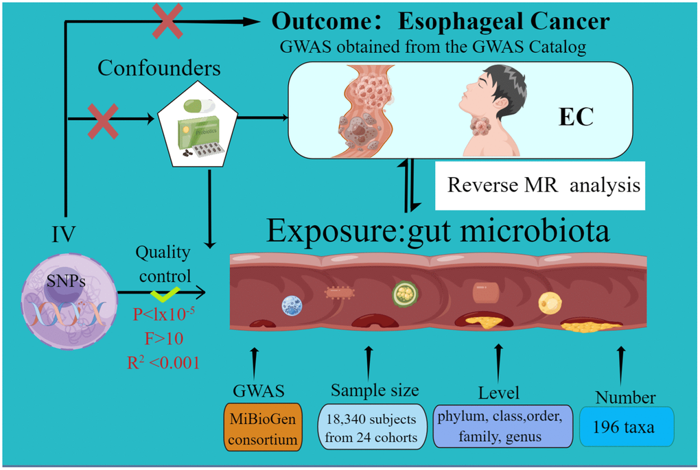 Esophageal carcinoma (EC) ranks as the seventh predominant malignancy globally, with roughly 604,100 documented incidences in 2020, constituting 3.1% of all cancerous diagnoses [1]. Additionally, this neoplastic disease accounted for an estimated 544,000 fatalities in the aforementioned year, signifying 5.5% of all oncology-associated mortalities, thereby placing it as the sixth leading etiology of cancer-induced death [2–4]. Globally, esophageal squamous cell carcinoma (ESCC) predominates as the principal histological subtype of esophageal malignancy, boasting an age-standardized incidence rate of 5.3 cases per 100,000 populaces [5, 6]. This incidence is quintuple that of esophageal adenocarcinoma (EAC), which has an age-standardized rate of 0.9 cases per 100,000 individuals [7, 8]. Individuals diagnosed with EC commonly manifest with advanced local progression and are frequently administered neoadjuvant chemoradiotherapy (CRT) or perioperative chemotherapy concomitant with surgical excision [9, 10]. Nonetheless, despite the successful culmination of conventional multidisciplinary treatment, numerous patients experience disease recurrence and ultimately succumb to the ailment [11, 12]. Factors that have been consistently recognized or associated with ESCC comprise tobacco smoking, alcohol ingestion, opium utilization, exposure to air contaminants, and specific dietary habits, notably a diminished intake of fruits and vegetables alongside an increased consumption of red meats and pickled products [13–15]. The complex etiological landscape of the disease hints at the existence of previously undetected elements influencing its pathogenesis. Notably, among these prospective contributors, the role of the gut microbiome is receiving amplified scholarly scrutiny [16]. The inception of the Human Microbiome Project, coupled with the accessibility of cost-effective high-throughput sequencing, has markedly transformed the direct exploration of the human microbiome’s impact on human health and pathophysiological conditions. The human microbiota has been suggested to be involved in tumorigenesis and the responsiveness to oncological treatments. The abundance, heterogeneity, and precise constitution of microbiota across various organs could potentially influence the pathogenesis of EC. Multiple research endeavors have posited that an imbalance within the gut microbial ecosystem, termed dysbiosis, could be implicated in the initiation and progression of esophageal neoplasia [17–23]. Individuals exhibiting reduced microbial richness in the esophagus and diminished salivary microbial diversity in China might be at an augmented risk of developing esophageal squamous dysplasia (a precursor to EC) and EC, correspondingly [24, 25]. An augmented abundance of Clostridiales and Erysipelotrichales in the gastric corpus may be implicated in the pathogenesis of esophageal squamous dysplasia and EC within the Iranian population [26]. Such discoveries have catalyzed inquiries into the nuanced interplay between the gut microbiome and EC. Regrettably, the determinations of the majority of contemporary observational research chiefly hinge upon the evaluation of the composition and alterations in gut microbiota derived from patients’ stool samples. Conventional observational research is constrained by intrinsic limitations, encompassing environmental confounders, selection biases, and the potential for reverse causality. While randomized controlled trials (RCTs) remain the benchmark for establishing causation, the vast multitude of gut microbial species combined with the extended latency from microbial dysbiosis to oncogenesis render RCTs challenging to implement within an authentic clinical context. In summation, the nexus between gut microbiota and Esophageal carcinoma continues to warrant further clarification.
