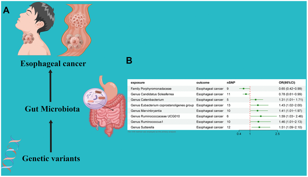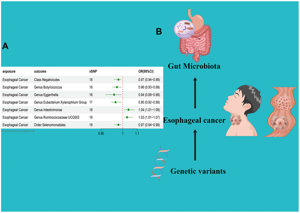 In this MR analysis, we present an inaugural thorough examination of the causal relationships between gut microbiota and esophageal cancer. Our results offer innovative understandings concerning the prophylaxis, disease progression, and therapeutic strategies for esophageal cancer by focusing on distinct bacterial taxa. Subsequent research is imperative to elucidate the precise mechanistic interplay between enteric microbiota and esophageal cancer associations. Nonetheless, additional investigations are requisite to ascertain the underlying mechanism delineating the association between gut microbiota and esophageal cancer.
