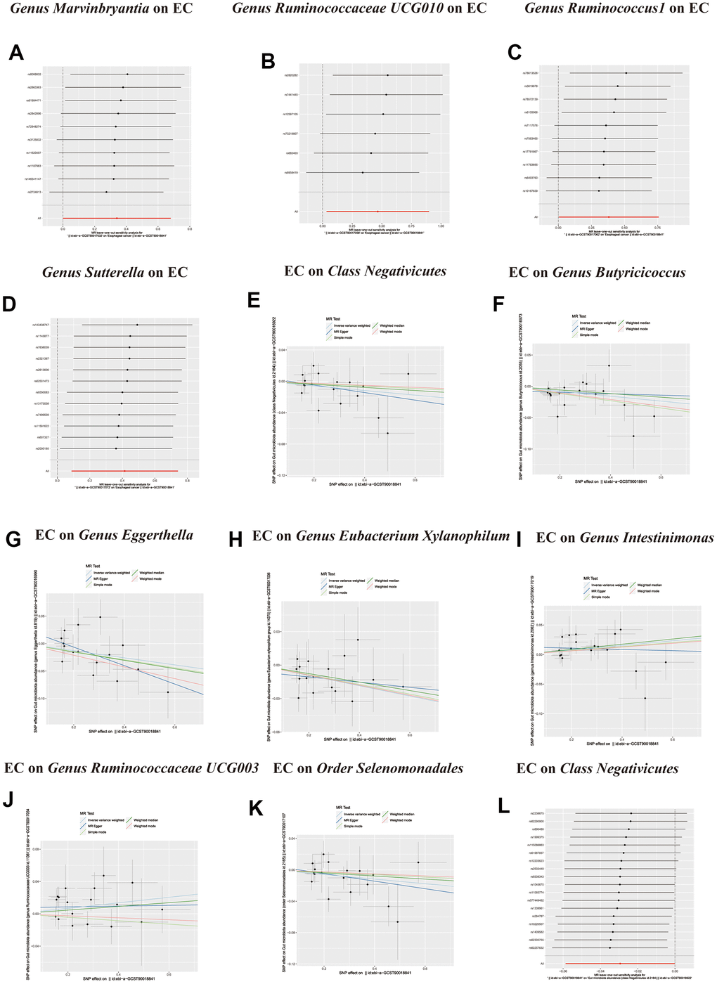An MR analysis was performed to ascertain the potential causal linkage between gut microbiota and esophageal cancer. Detailed findings are presented in Table 1. Through the application of the IVW analytical approach, we determined that the Family Streptococcaceae (OR 0.65, 95% CI 0.42–0.99, P = 0.048) and Genus Candidatus Soleaferrea(OR 0.78, 95% CI 0.61–0.99, P = 0.048) demonstrated an inverse association with susceptibility to esophageal cancer. In contrast, positive correlations with esophageal cancer risk were evident for the Genus Catenibacterium (OR=1.31, 95% CI:1.01–1.71, P=0.044), Genus Eubacterium coprostanoligenes (OR=1.43, 95% CI:1.02–2.00, P=0.038), Genus Marvinbryantia (OR=1.41, 95% CI:1.01–1.97, P=0.049), Genus Ruminococcaceae UCG010 (OR=1.59, 95% CI:1.03–2.46, P=0.034), Genus Ruminococcus1 (OR=1.46, 95% CI:1.01–2.13, P=0.047), and Genus Sutterella (OR=1.51, 95% CI:1.09–2.10, P=0.012). (Figure 2) Utilizing both the IVW test and MR-Egger, the outcomes of Cochran’s Q test revealed an absence of notable heterogeneity between the gut microbiome and esophageal cancer. The MR-Egger regression analysis provided no indications of horizontal pleiotropy. Furthermore, the MR-PRESSO evaluation identified no significant outliers, and the leave-one-out analysis corroborated the robustness of the data (Table 1 and Supplementary Table 2 and Figures 2, 3).