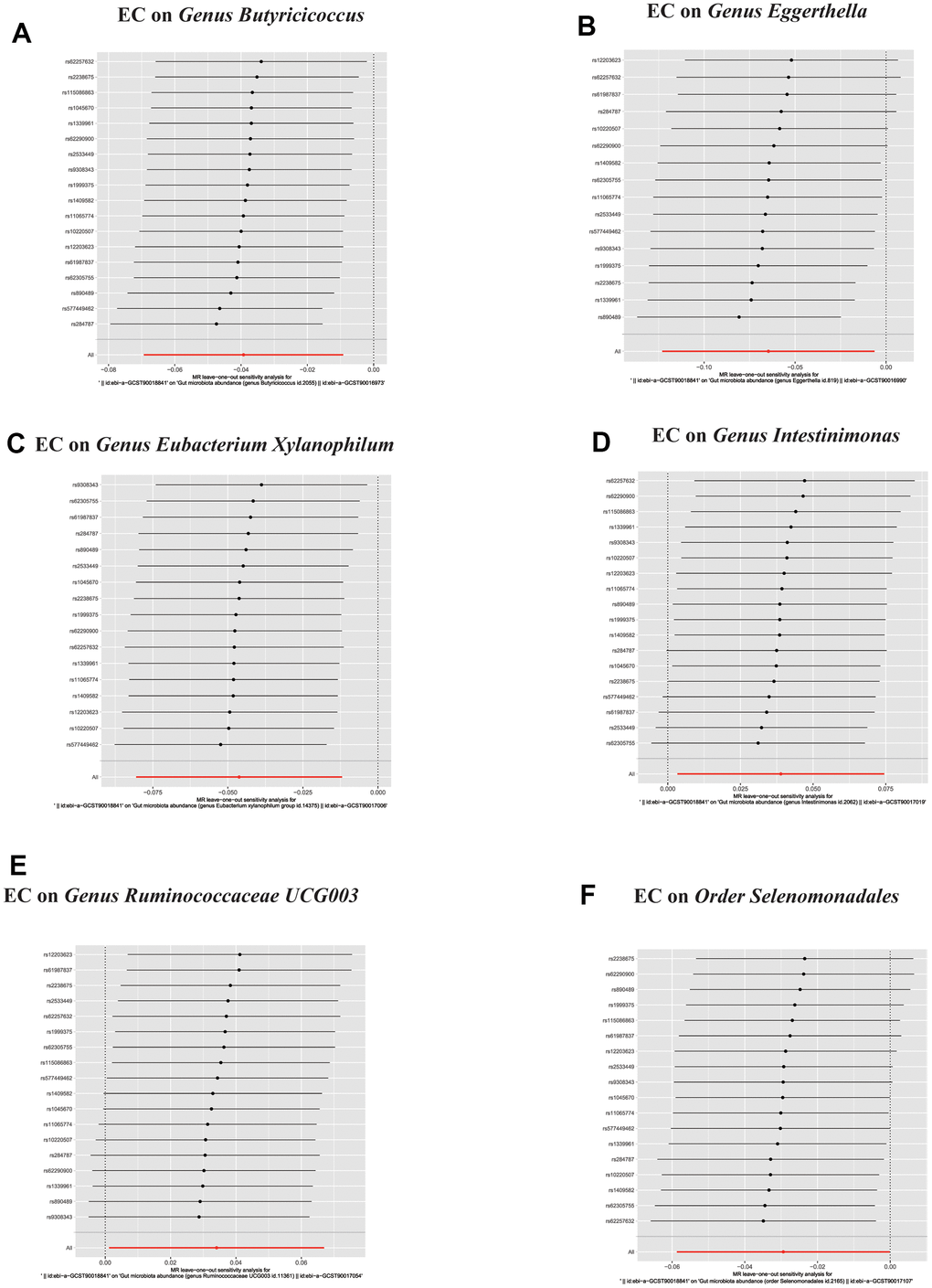 In the reverse direction MR analysis, we used Esophageal cancer as the exposure and gut microbiota as the outcome to assess any reverse causation effects. After analysis using the MR method, Esophageal cancer had a causal effect on one Class, one Order and five Genera. Through IVW, the Class Negativicutes (OR=0.97, 95% CI:0.94–0.99, P=0.048), OrderSelenomonadales (OR=0.97, 95% CI:0.94–0.99, P=0.048), Genus Butyricicoccus (OR=0.96, 95% CI:0.93–0.99, P=0.010), Genus Eggerthella (OR=0.94, 95% CI:0.88–0.99, P=0.029) and Genus Eubacterium Xylanophilum Group (OR=0.95, 95% CI:0.92–0.99, P=0.008) were down-regulated after the onset of Esophageal cancer. The Genus Intestinimonas (OR=1.04, 95% CI:1.01–1.08, P=0.032) and Genus Ruminococcaceae UCG003 (OR=1.03, 95% CI:1.01–1.07, P=0.042) were up-regulated after the onset of Esophageal cancer. Among the IVs, we detected neither weak instrument bias nor notable heterogeneity statistics. Additionally, no evidence of horizontal pleiotropy was observed between the IVs and the gut microbiome. The MR-PRESSO assessment revealed an absence of significant outliers. Moreover, the robustness of the data was corroborated through the leave-one-out analysis (Table 2 and Supplementary Tables 3, 4 and Figures 4–6).