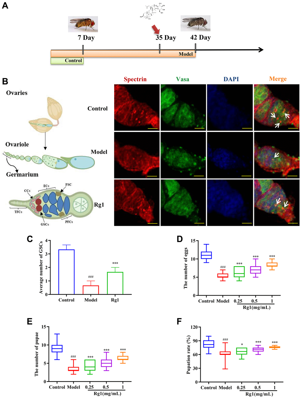 The control and model groups were fed with standard basal medium, and the remaining three treatment groups were fed with 0.25, 0.5, and 1 mg/mL of ginsenoside Rg1 in basal medium. After 7 days, the flies in each group were transferred to new tubes containing basal medium to lay eggs for 48 h. The eggs and pupae were counted, and the pupation rate per tube was computed, in order to assess the impacts of ginsenoside Rg1 on the growth and reproduction of female Drosophila [25]. Results for assessments derived from three separate trials were provided as mean ± standard deviation (SD).