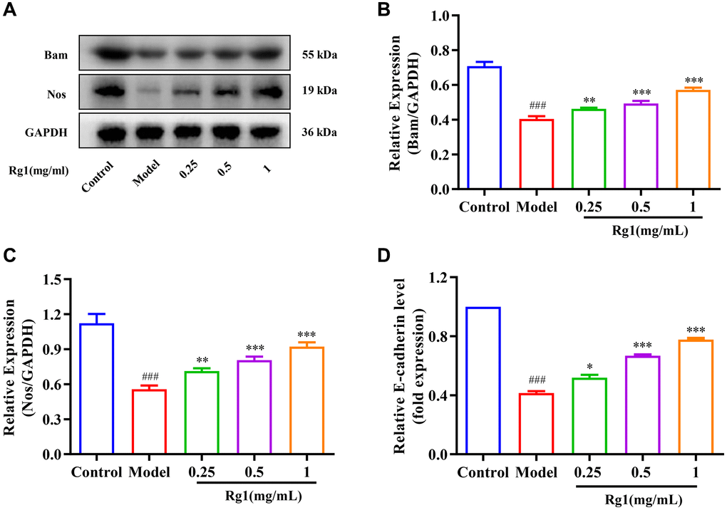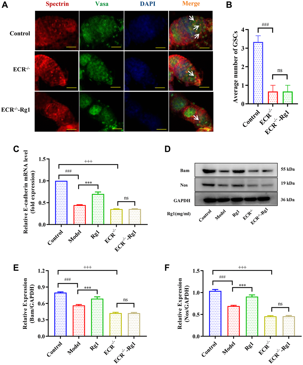 The regeneration of GSCs is directly regulated by their niche. The ovarian niche transmits important cytokines to GSCs. For example, Nos and Bam regulate the stemness and differentiation of reproductive stem cells. E-cadherin in the niche maintains the stem cell population by immobilizing GSCs to prevent shedding. The expression of Nos, Bam and E-cadherin decreased significantly in aged Drosophila, resulting in niche imbalance (Figure 2). Ginsenoside Rg1 substantially increased the Bam, Nos, and E-cadherin expression in the aging GSCs niche (Figure 2A–2D). According to these findings, ginsenoside Rg1 can inhibit age-induced niche imbalance.