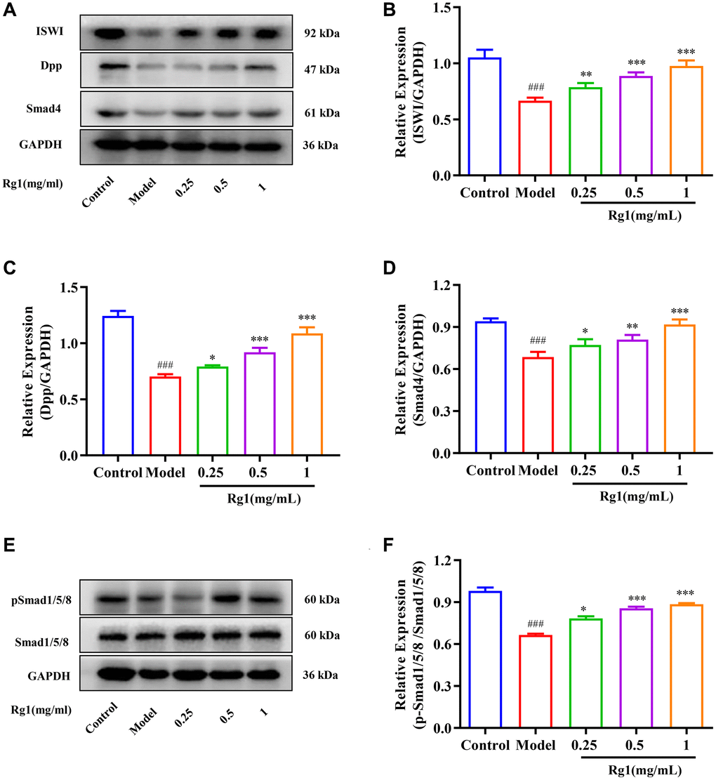The BMP signal is the most important signal to regulate niche activity. Diminished BMP signaling in niche leads to decreased GSCs and reduced ovarian function consequently. When exposed to higher concentration of ginsenoside Rg1, the expression of ISWI and the BMP ligand Dpp in the ovaries of aged Drosophila was promoted (Figure 3A–3C). In addition, the molecular marker for BMP signal activation is phosphorylation Smad1/5/8, which forms a complex with Smad4 to control Nos and Bam expression in GSCs niche. The expression of pSmad1/5/8 and Smad4 were significantly increased in aged female Drosophila with ginsenoside Rg1 treatment (Figure 3D–3F). These suggested that ginsenoside Rg1 activates BMP signaling to regulate the homeostatin of GSCs niche, and promote GSCs regeneration.