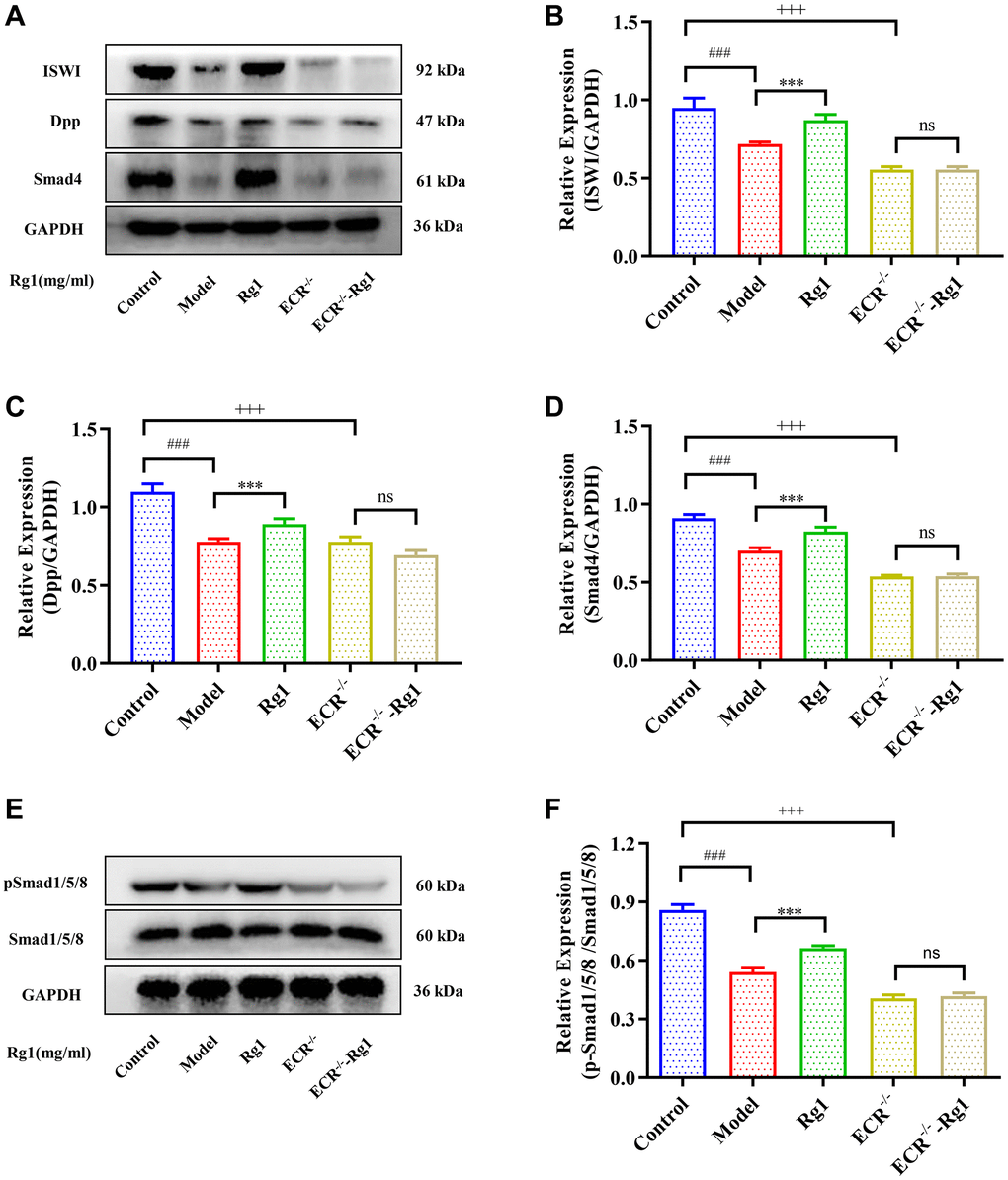 To demonstrate that ginsenoside Rg1 functions similarly to steroid hormones, we investigated the targeting effect of ginsenoside Rg1 on ECR gene knockdown in female Drosophila. The average number of GSCs in ECR mutant was 0.67, while the average number of GSCs in young Drosophila was 3.33. Ginsenoside Rg1 treatment did not increase the number of GSCs in the ovaries of ECR mutants (Figure 5A, 5B). Compared to wild-type flies, ECR knockout flies produced fewer eggs, pupa, had smaller ovarian tissue, and ecdysterone levels were lower, ginsenoside Rg1 failed to improve these phenomena (Supplementary Figure 3A–3D). Furthermore, the expression of factors that maintain the stemness of GSCs, including E-cadherin, Bam, and Nos, were not increased in ECR mutants by ginsenoside Rg1 treatment (Figure 5B–5F). These results suggested that ginsenoside Rg1 might depend on ECR in maintaining the GSCs stemness in aged female Drosophila. The BMP signaling pathway was inhibited when ECR was knocked out. The expression of ISWI, Dpp, Smad4 and pSmad1/5/8 were not restored after ginsenoside Rg1 treatment in ECR mutant Drosophila, which was contrary to the findings in aged ones (Figure 6). The above results proved that ginsenoside Rg1 target ECR to activate the niche BMP signaling pathway.