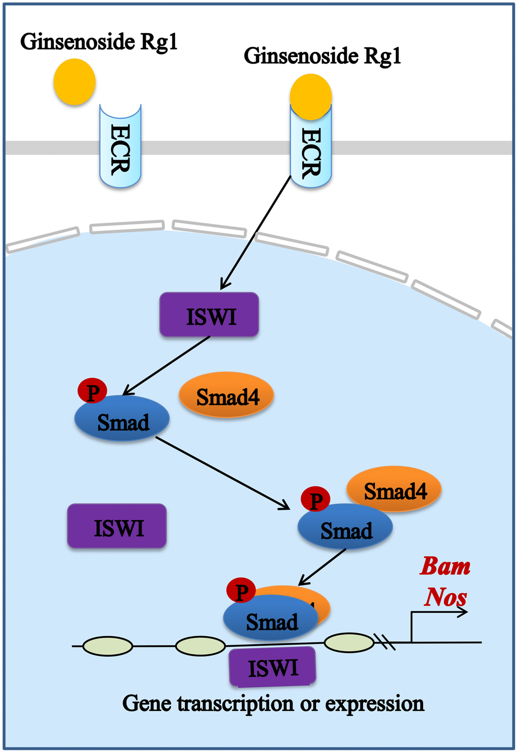 Estrogen is produced by the ovaries and is responsible for regulating the stability of the GSCs niche. Studies have demonstrated that estrogen bound to nuclear receptors in mammals can trigger conformational changes of the receptors to allow transcriptional coactivator binding and transcription initiation complex assembly, playing an important regulatory role in the GSCs niche [42, 43]. Similar to mammals, ecdysterone attaches to the steroid hormone receptor ECR in female Drosophila, activating the production of early E74 and Br transcription factors to regulate niche balance (Supplementary Figure 3) [44]. We also obtained the same results (Supplementary Figure 4). It is further proved that the ginsenoside Rg1 had a complementary replacement for the lack of ecdysterone in the aging ovaries, which could bind effectively to the receptor ECR. In addition, ECR can be involved in BMP signaling through the activation of chromatin remodeling factor ISWI [45]. The BMP signaling in niche is a central signal that regulates the GSCs stemness. GSCs in the niche secrete BMP ligands that promote the phosphorylation of Samd1/5/8 [46]. pSmad1/5/8 forms a complex with Smad4 to activate the promoter activity of stem cell maintenance factor Nos and differentiation factor Bam to increase the number of GSCs [47, 48]. In this study, ginsenoside Rg1 activates ECR to increase BMP signal strength (Figure 7). In addition, BMP signal intensity as well as GSCs number were not recovered in ECR mutant female Drosophila treated with ginsenoside Rg1. This suggested that ginsenoside Rg1 regulates the niche to maintain GSCs self-renewal through targeting ECR/BMP signaling pathway.