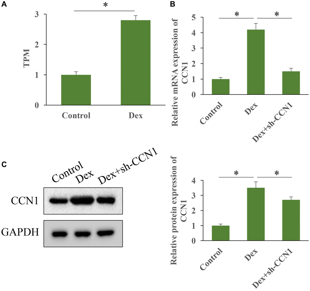 High throughput sequencing was performed to investigate the influence of Dex treatment on expression of CCN1 (Figure 1A). We found that Dex treatment markedly increased the level of CCN1 in vivo (Figure 1A). In addition, the mRNA and protein expression intensity of CCN1 was markedly elevated by Dex, but transfection with sh-CCN1 significantly suppressed the level of CCN1 (Figure 1B, 1C).