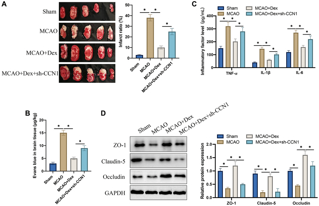 The MCAO animal model was firstly established. We found that the remarkable increase of infarct ratio in MCAO rats was greatly inhibited after Dex treatment (Figure 2A). However, the infarct area was elevated greatly by treatment with sh-CCN1 vectors (Figure 2A). The BBB breakdown in vivo was assessed through Evans blue staining. The blood brain barrier breakdown was aggravated in the MCAO model, but it was relieved after Dex treatment (Figure 2B). However, knockdown of CCN1 could aggravate the blood brain barrier breakdown. In addition, we found that Dex administration could decrease the levels of inflammatory factors including IL-6, IL-1β, and TNF-α (Figure 2C), but they were restrained after knocking down CCN1 (Figure 2C). We also investigate the levels of tight junction protein expression with Immunofluorescence staining after Dex or sh-CCN1 treatments. Dex could markedly promote the levels of Occludin, Claudin-5, and ZO-1, but they were greatly suppressed by sh-CCN1 (Figure 2D). These finding indicate that Dex might regulate cerebral ischemia injury induced blood brain barrier breakdown through regulating CCN1.