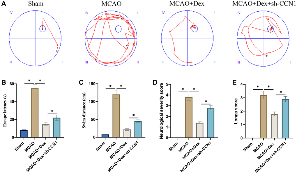 Morris water maze test was performed to evaluate the influence of Dex and sh-CCN1 on memory ability of rats. Significant increase of escape latency and swim distance were observed in the group MCAO (Figure 3A–3C). However, Dex treatment significantly inhibited escape latency and swim distance compared with group MCAO (Figure 3A–3C), but the change trends of escape latency and swim distance induced by Dex were greatly reversed by sh-CCN1. The neurological function was evaluated with neurological severity and Longa scores (Figure 3D, 3E). The remarkable improvement of neurological function caused by Dex was markedly inhibited by sh-CCN1 (Figure 3D, 3E).