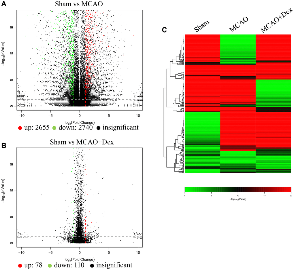 Gene differences were analyzed using volcano plot (Figure 4A, 4B), which indicate 2655 up-regulated genes and 2740 down-regulated genes between group Sham and group MCAO. However, 78 up-regulated genes and 110 down-regulated genes between group Sham and group MCAO+Dex were observed, which suggests that Dex treatment reduced the gene difference changes. Similar data was obtained through Pheatmap analysis (Figure 4C, red color: up-regulated genes, green color: down-regulated genes, black color: un-different genes).